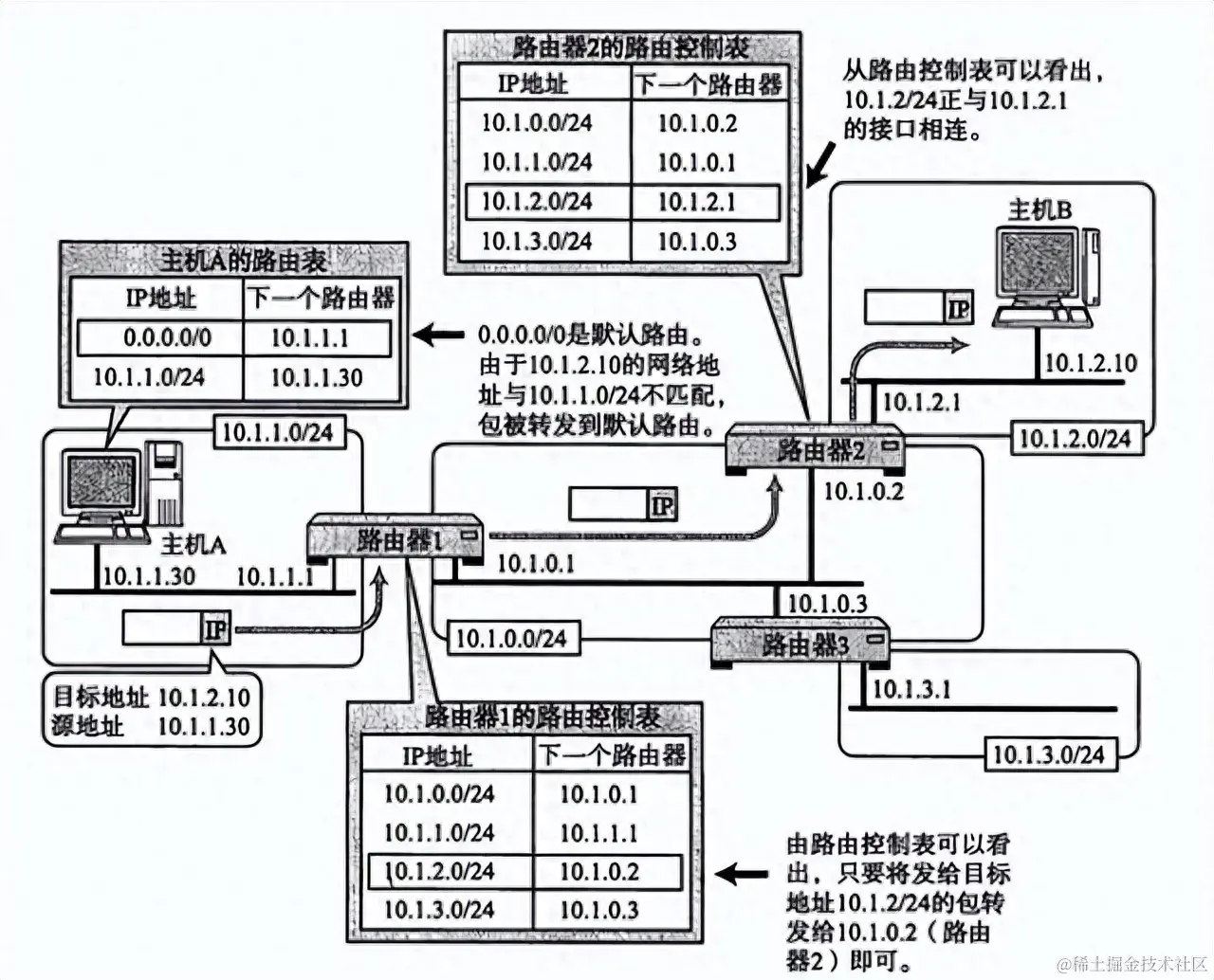 在发送 IP 包时,首先要确定 IP 包首部中的目标地址,再从路由控制表中找到与该地址具有相同网络地址的记录,根据该记录将 IP 包转发给相应的下一个路由器。如果路由控制表中存在多条相同网络地址的记录,就选择一个最为吻合的网络地址。