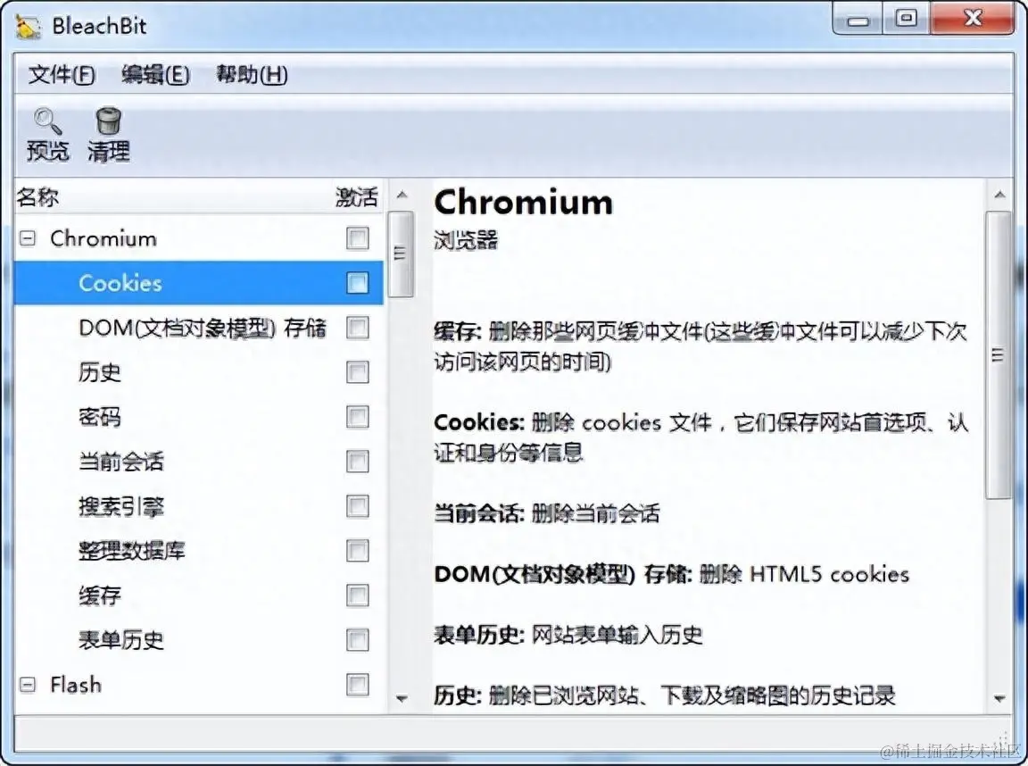 BleachBit 是一款系统清理工具,可以快速释放磁盘空间,保护用户的隐私。BleachBit 可以清理缓存、删除 cookies、清除浏览历史、粉碎临时文件、删除日志、清除垃圾等。BleachBit 还包含一些特别的功能,如使用安全删除技术防止文件恢复,擦除空闲磁盘空间以隐藏其他应用程序删除的文件痕迹,对 Firefox 进行优化以提高速度等。