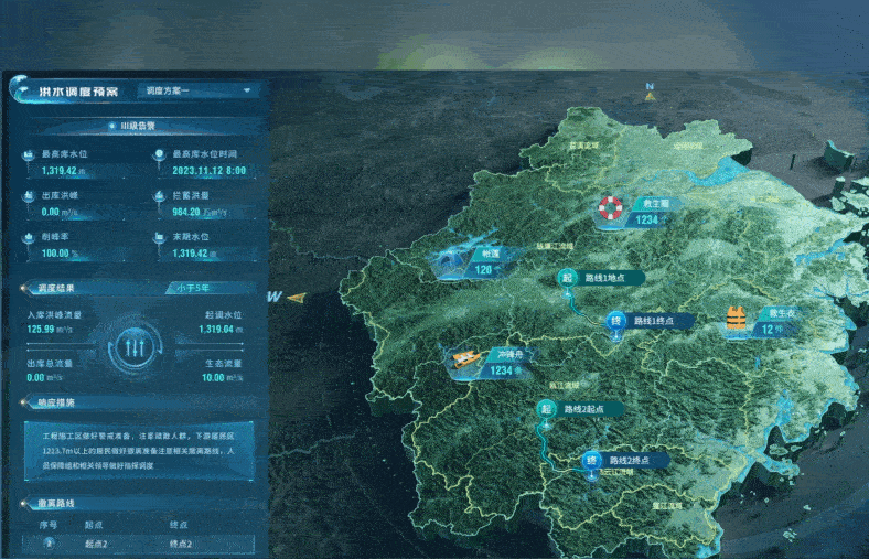 平台支持集成各类防洪方案、调度规则和专家经验,结合多方案的预演反馈结果,自动生成最优调度方案,并优选确定抗御不同等级洪灾的行动方案或计划。包括人员物资通讯保障,调度预案,居民避险转移路线等,明确好调度的机制以及信息流程,并组织相关的实施。