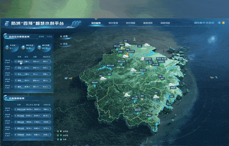 预报是指对未来水文和气象条件进行预测和分析,以便有效地管理水资源、监测河流流量、洪水预警以及采取必要的防洪措施。平台内置**“降水—产流—汇流”全过程模型**,根据历史及实时的水文、气象等信息,开展对应流域水文预报,借助专业水文模型以帮助预测洪水和流域的水文状况,完成水雨情监测预报全要素信息的可视化,以实现融合展示、降雨、流域的雨情预报。