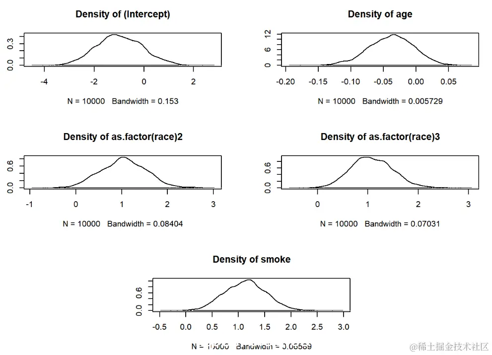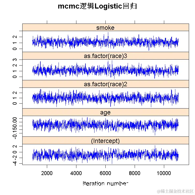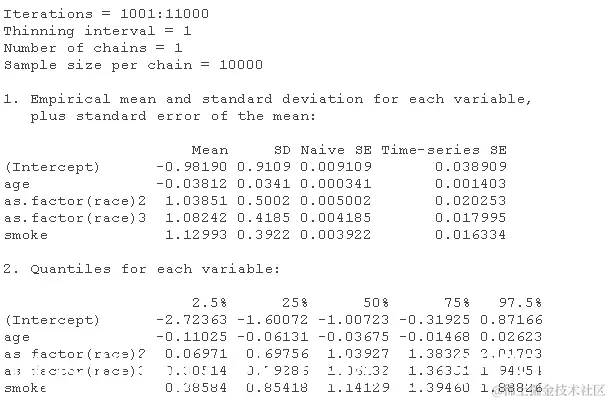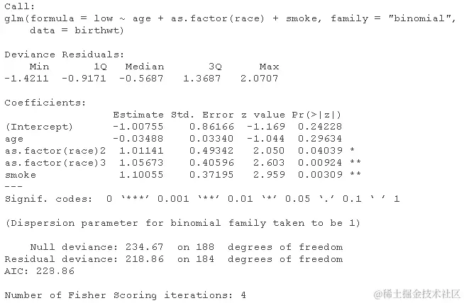 logitmcmc(low~age+as.factor(race)+smoke )