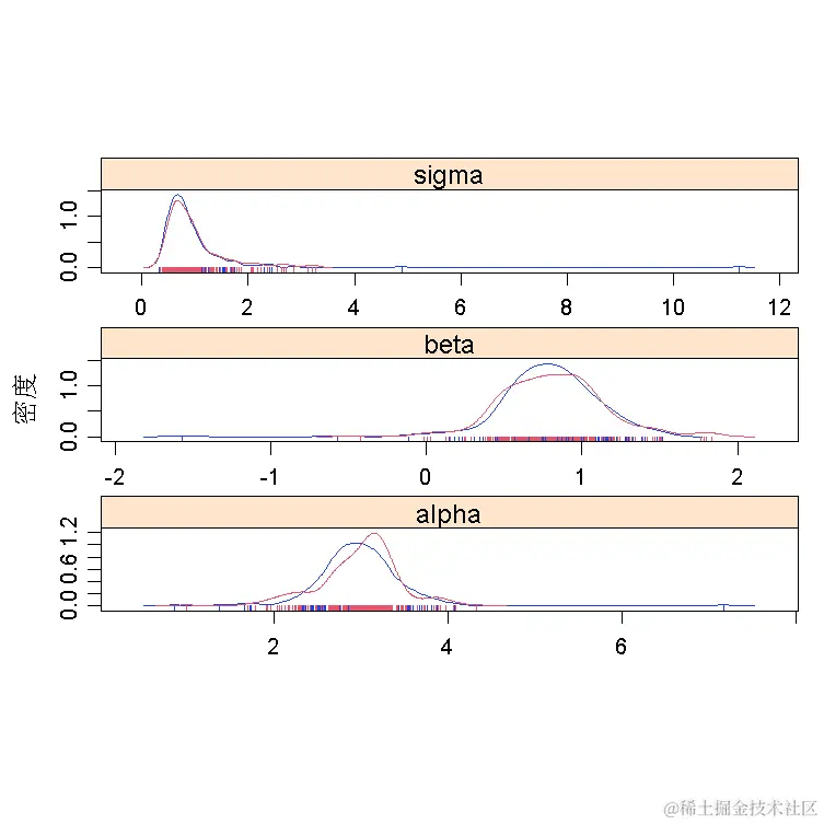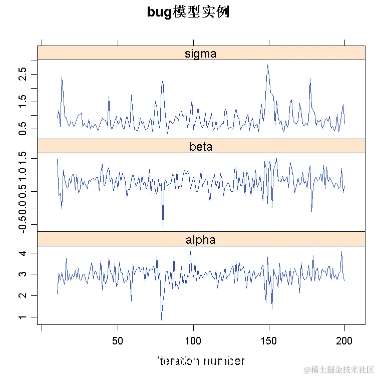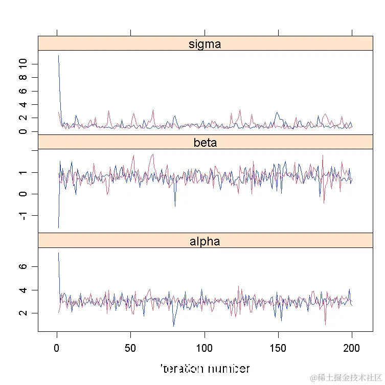 R软件包帮助分析MCMC链。一个例子是线性回归的贝叶斯拟合(α,β,σ