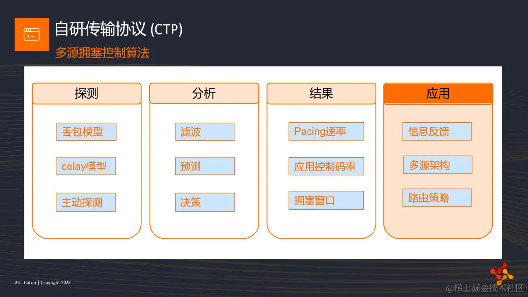 在我们的自研协议CTP中,主要的特点是一方面会将前面提到的丢包模式的结果应用到拥塞控制的分析模块进行优化;另一方面,我们基于C3系统的多源多目标的架构特性,在应用模块,针对性地做出了一些策略优化。多源多目标的架构我会在第三部分展开描述。对于拥塞控制的研究我们也一直有在进行。