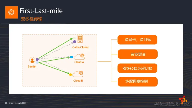 最后,也是最重要的一点,包级别的自适应路径切换。发送端SDK会利用原始数据包或者空闲时间段的链路探测包不断的进行链路质量探测。第一个机制就是自适应容灾避障机制,当探测到某条子链路出现突发故障,会迅速的切换至另一条子链路发送,结合丢包重传机制,可以保证只要有一条子链路是可用的情况下,所有数据包都可以无差别的传输至核心网中。我们还实现了QoS分级策略,不同的业务流可以有不同的切换策略。第三是针对不同的物理链路进行优化,因为用户端往往有多种不同的链路类型,包括cable, 5G, WiFi等。不同的链路会有不同的发送策略调整。最后是连接迁移,这其实也是通过协议保障的一个地方。