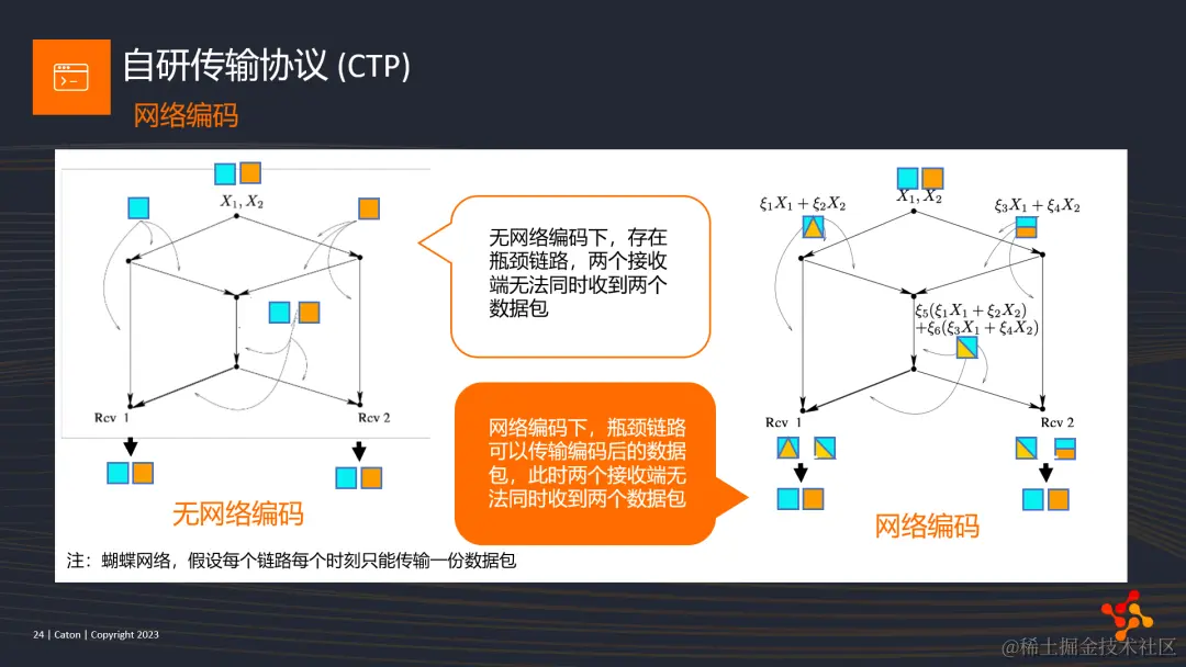 最后一点,是网络编码。网络编码这个概念其实早在2000年提出,将传统的路由器引入编码功能,以提高信息的传输效率。图上是经典的解释网络编码原理的网络结构:蝴蝶网络,即假设每个链路每个时刻只能传输一个数据包。传统的发送方式,由于中间瓶颈链路的存在,两个接收端无法同时收到两个数据包。但如果每个节点加入了网络编码,就可以利用重编码功能实现同时接收,实现网络传输效率的提高。在我们的C3 overlay核心网pop点中,天然地支持编码功能,这也是我们引入该技术的基础所在。我们在某些要求超低延迟和抖动的业务场景中率先落地了网络编码功能,实现了很好的传输效果。对于其他业务场景,我们也在积极探索网络编码的潜力,优化网络传输质量。