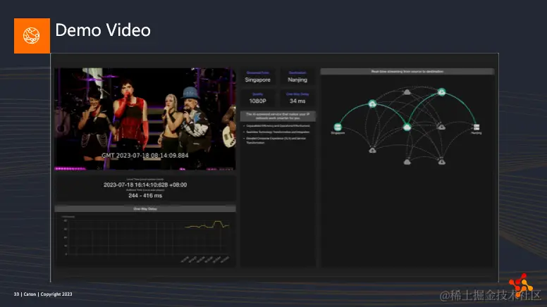 我们公司搭建了一个在线demo展示,上面的视频是实时传输的视频流,一共有两条,一条是从新加坡传输至南京,另一条是从新加坡传输至美国俄勒冈。我提前录制了一个简短的视频,在那个时刻这个流是通过Caton Media Xstream平台实时传输的。图上有具体的单向延迟数据,右边显示的是实时的传输路径,用户可以直观地观察到当前流量是如何在路径树中进行传输和切换的。如果大家有兴趣,我们可以线下展示给大家看。