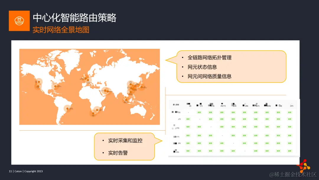 首先是中心化智能路由策略,要想实现流量在全球范围内的最佳路径规划,首先必须掌握全链路的网络状态信息,即实时网络全景地图。如图所示,我们在全球范围内部署了多台网络服务器作为C3核心网的pop节点,会实时探测相互之间的网络质量信息并上报C3控制面;相信很多公司都能做到对自己自建的核心网络进行高效的监控和告警,但我们更进一步,不仅仅采集自建核心网之间的网络数据,还会探测并收集该地区其他可探测的ASN网络数据,构建一个真正聚合众多ASN网络质量数据的实时网络全景地图。这些大数据也为C3架构持续优化和迭代升级提供重要的大数据支撑。