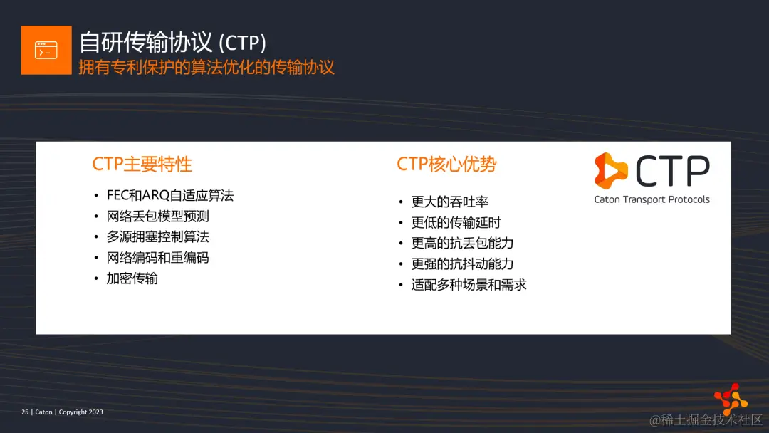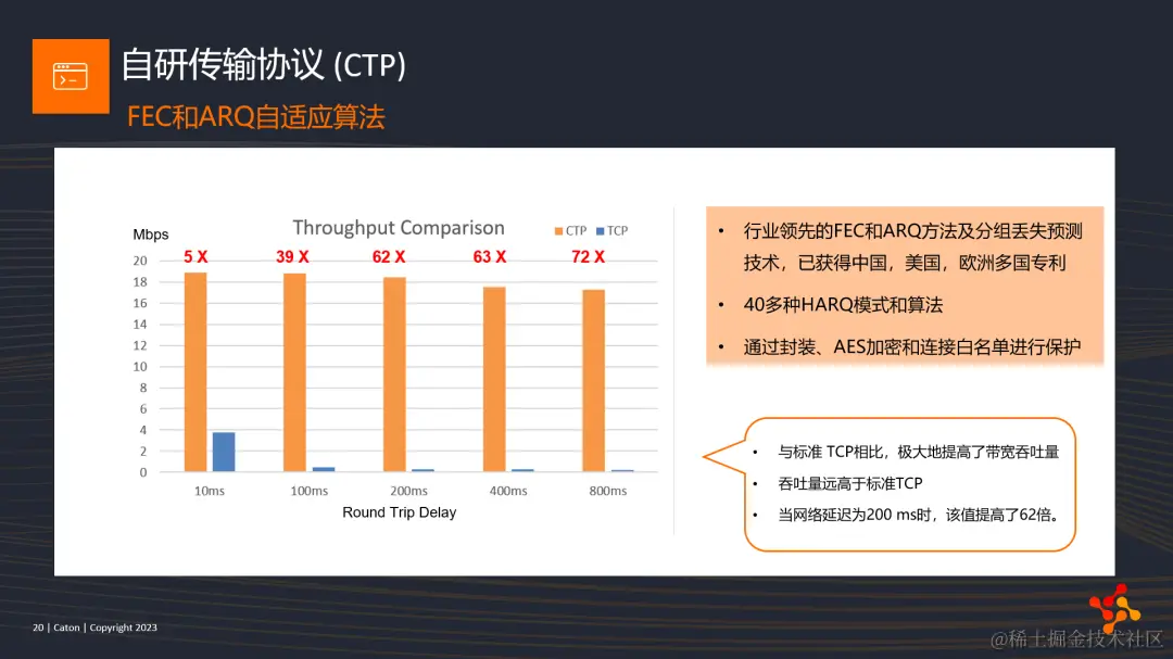 图上是我们同事早期做的一个性能测试,对比了标准TCP的吞吐量,当在网络延迟为200ms时,吞吐量提高了62倍。当然,现在很多基于UDP的协议都能做到很高的吞吐量,但我们的CTP很早就将其应用于流媒体传输中,而且会根据多年积累的网络经验,不断去优化迭代该协议。