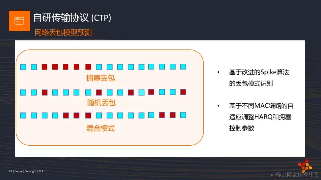 那么,在已经有了智能路由策略后,如何保障数据包在两个pop点之间的传输可靠性呢?这就是我分享的第二部分,我们自研的传输协议CTP。我们的CTP协议与很多新兴的多媒体协议一样,都是基于UDP之上,做一些可靠性传输机制的优化。基本上各个技术公司都会自研协议,加入一些最适合自身业务的一些特性,当然,我们也不例外。所以我就抛砖引玉,只展开讲讲其中几个针对我们系统优化的特性,希望能给大家一些启发,也欢迎大家一起讨论这部分传输协议的优化内容。