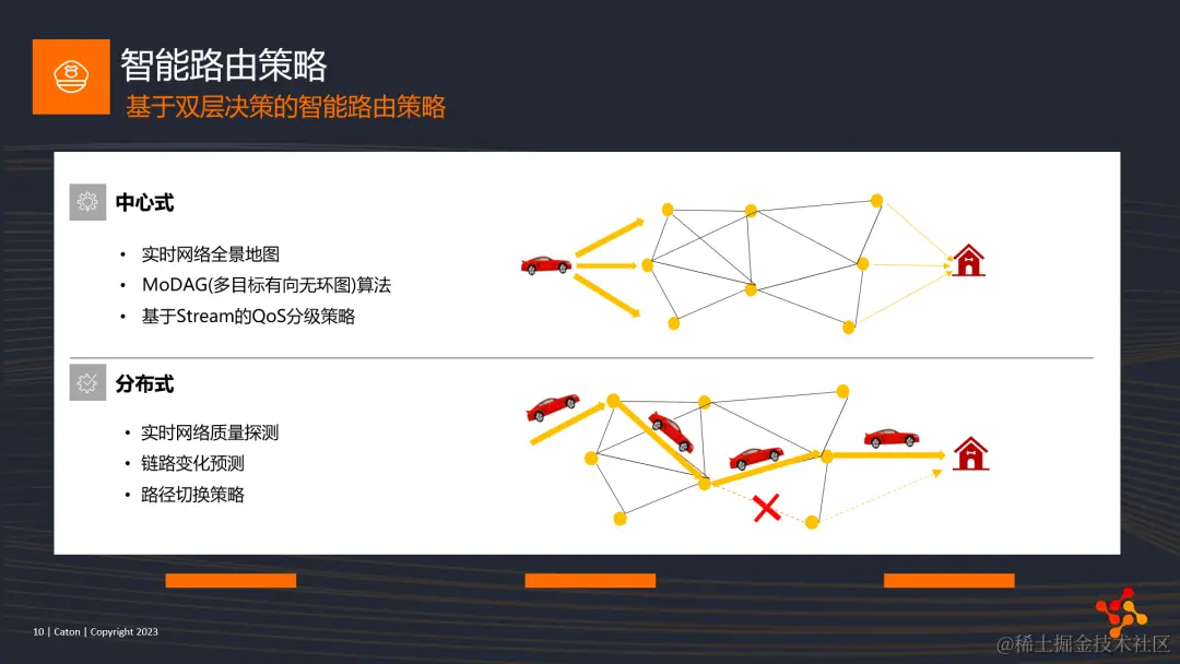 第二层,分布式的路由决策。路径图上的每个节点都会实时维护与邻居节点的网络质量,当汽车行驶到该节点时,根据当前收集的所有子链路的网络质量,以及预测各个链路的变化趋势,选择最佳的下一跳路径进行传输,遇到临时修路封路,类比网络故障,汽车可以自动换路,选择另一条路径送达目的地。目标就是让所有的包裹都可以在满足各自业务需求的情况下,以最高的效率安全到达目的地。