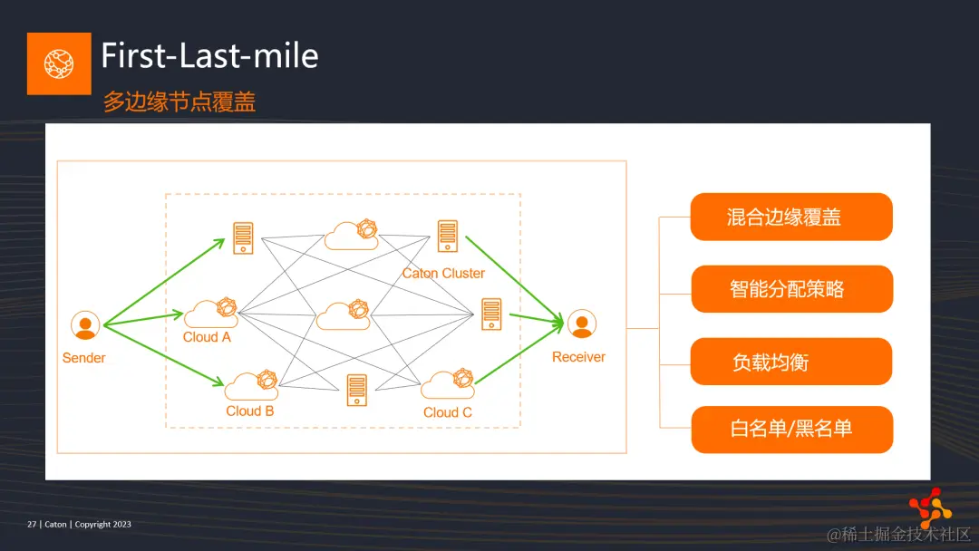 我们来看First-Last-mile的第一点,多边缘节点覆盖。我们为每个用户端的每个ISP接入选择至多3个节点进行覆盖,无论是发送端还是接收端;匹配的原则会尽量满足混合pop覆盖,即保证有云主机pop点和自建机房pop点同时覆盖;云主机主要是考虑其稳定性,自建机房主要考虑的是成本和带宽。