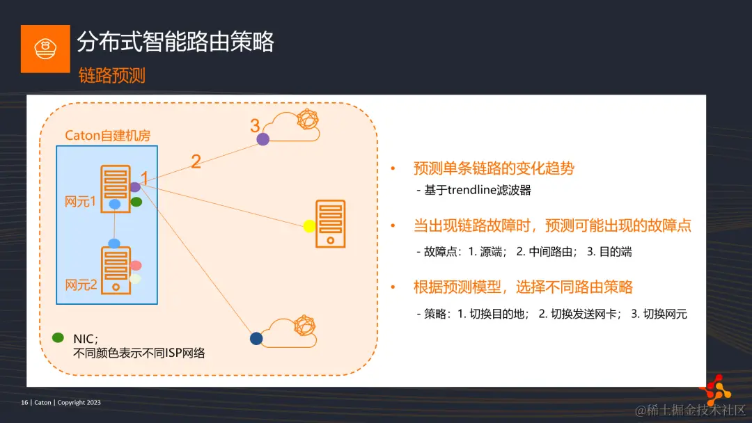 在各个节点中,除了探测网络链路质量,我们还加入了链路预测模型。我们会利用滤波器来预测单条链路的变化趋势。同时,当链路出现故障时,我们会尝试去预测可能出现的故障,是源端出口网络、还是中间链路,或者目的地入口网络的问题。根据预测的结果,来选择是否切换网络、还是切换下一跳的目的地,抑或切换同个机房的另一个pop点。