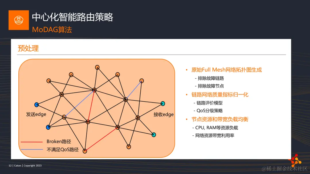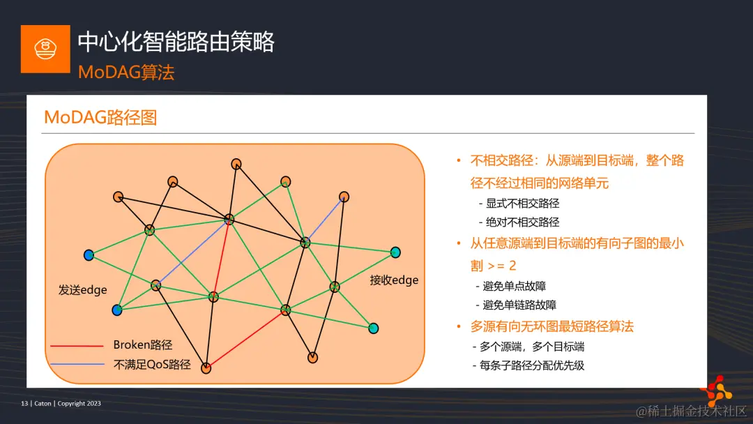 总而言之,中心化智能路由策略是输出一个最佳的路径有向无环图,并将结果通过平台下发给流的源端的边缘节点,用以指导该流的传输。
