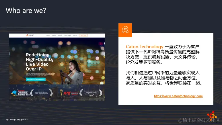 科腾科技是一家以技术为核心驱动力的高科技公司,一直致力于为客户提供下一代IP网络高质量传输的完整解决方案,包括编解码器,大文件传输,IP分发等多项服务;我们相信通过IP网络的力量能够实现人与人,人与物,以及物与物之间全方位,高质量的实时交互,将世界连接在一起。今天,我分享的就是科腾新推出的服务平台Caton Media Xstream。我将从多个维度介绍该平台特点和背后的相关技术。