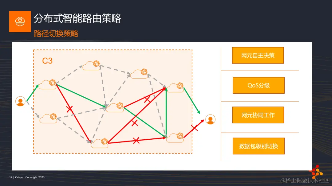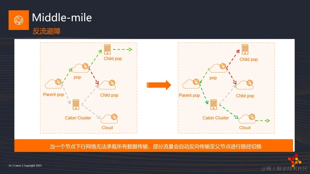 第二个是Middle-mile机制时反流避障机制。如图所示,当流量传输至一个节点时,如果只是其中一条子链路出现问题,那么该节点会自适应切换另外一条子链路;但是当所有子链路都出现了网络问题时,该节点会自动通知其父节点进行主动换路,而且会将传输失败的数据包反向发送给父节点,进行补偿传输。只要数据包在C3核心网络中的传输时间没有超过其应用规定的最大超时时间,该包就不会被主动丢弃,会尝试所有子路径,直至传输成功。