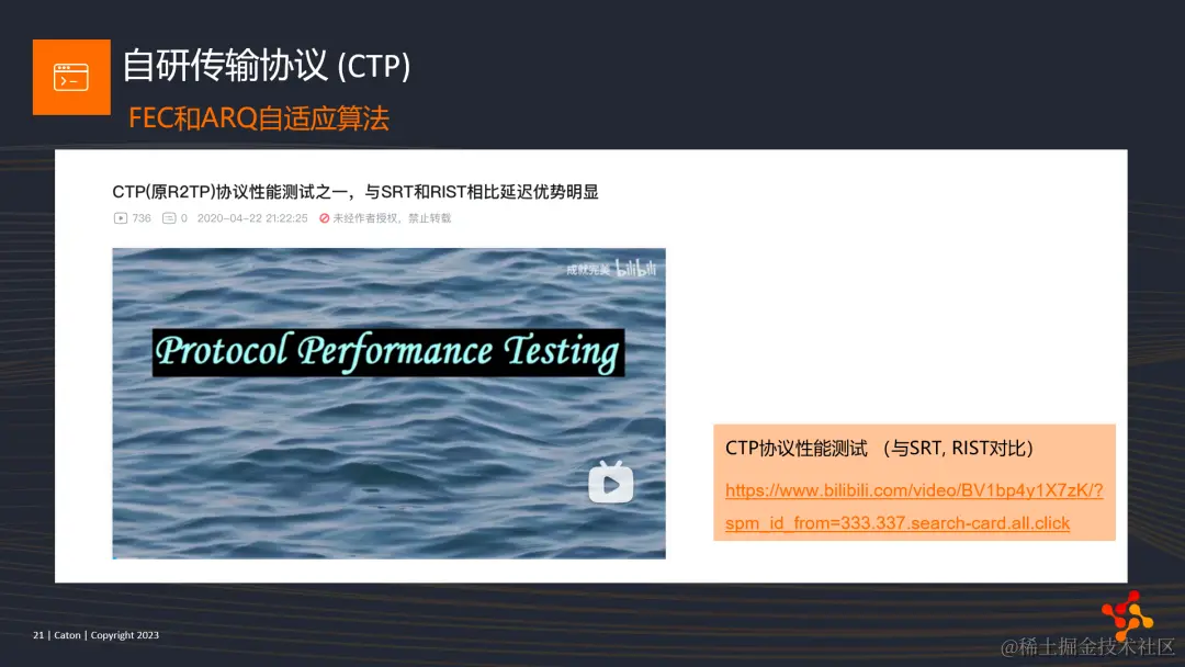 我们对第二部分自研协议做个简单总结。其实协议只是传输中的一小部分,目前也有很多类似的协议应用于各种场景中,比如QUIC协议,SRT,ZIXI等多媒体传输协议等等。我们的自研协议是在C3架构上做出的我们认为最合适的优化策略。当然,我们也会持续地在这方面进行优化。