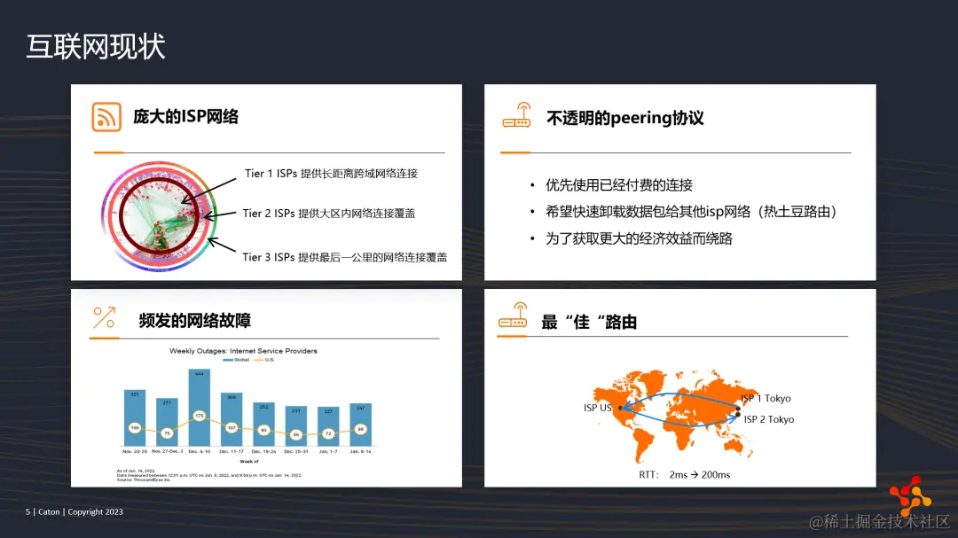 二、如此多的ISP运营商之间的流量传输,会使用BGP路由进行传输,不同ISP之间有各种不透明的peering协议;我们可以了解到的就有不少原则,例如第一运营商会优先使用已经付费的连接;第二热土豆路由,供应商总是希望快速卸载数据包给其他的ISP网络;第三,有时候会为了获取更大的经济效益选择绕路;这些问题,都会导致公共互联网之间的基础协议和设施无法做到全球统一管理,来保证高质量的数据传输。