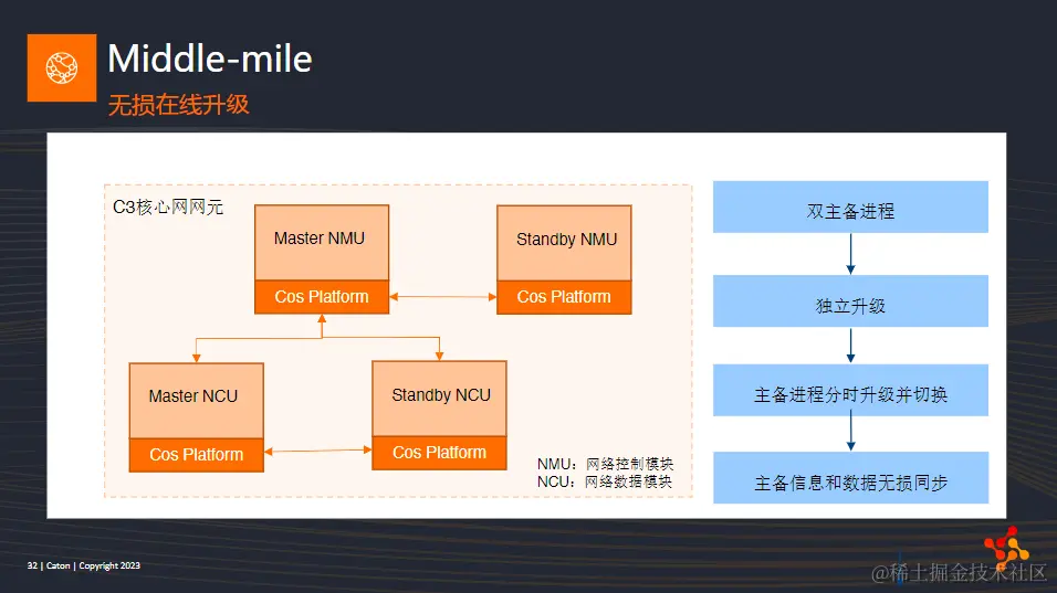 最后,是核心网pop点的无损在线升级机制。作为一个SaaS平台,功能的迭代和升级不可避免。首先,我们保障了在升级过程中所有流量不间断,而且不会有任何丢帧错误发生,同时还实现了升级过程中,核心网的整体承载能力不下降。有些系统可能在升级某个pop点时,会将该点的流量先切到另一个pop点上,此时,接收端是会感知到该行为的,甚至会发生丢帧现象。而且这个pop点的升级过程中是无法承载任何流量传输的,这时候整个网络所能承载的最大流量其实是下降的。但我们的升级可以做到零丢帧的同时,整体承载能力不下降。如果把核心网比作一个传输水流的管道,那么在升级过程中,不仅仅管道中的流不受任何影响,同时管道的最大容量也不会有任何变化。实现的原理就是在控制面和数据面都采用了双主备的机制,主备之间的数据可以进行无损的信息同步。