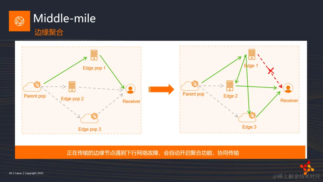 第一个是边缘聚合。当数据到达边缘节点,并转发给接收者时,下行链路出现了故障。该边缘节点会自动触发聚合机制,将数据包转发至另外的,也与该接收者建立好连接的其他边缘节点,通过其进行relay传输。保证接收者可以及时地、无错误地收到所有数据。实现这套机制,需要所有边缘节点协同工作才能达到这个效果。