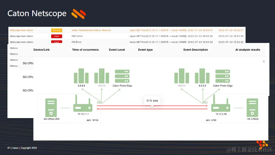 从生态上,Caton Cloud是一个服务体系,聚焦在网络相关的服务,前面介绍的caton Media Xstream是其中最关键的网络传输服务;除此之外,我们还提供了一个实时网络性能监控和诊断服务,NetScope。