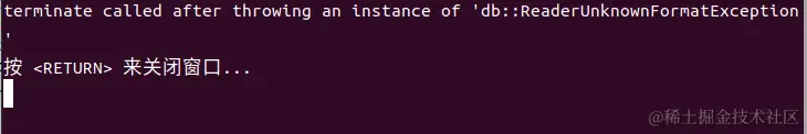 执行db::Reader reader (instream)创建一个Reader对象,报错如下所示