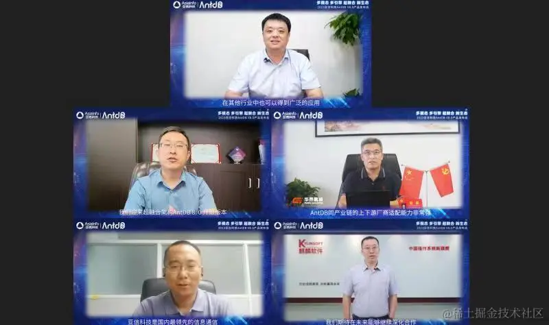 本次发布会,浙江移动信息技术与数据管理部总经理王晓征、用友网络科技股份有限公司助理总裁纪录、北京华录高诚科技有限公司总经理宋延、无锡金云智联科技有限公司数字化事业部总经理房坤韬、麒麟软件生态与技术服务中心副总经理金凯等嘉宾从不同行业,分享了与AntDB数据库的合作实践,以及对数据库未来发展的精彩观点。