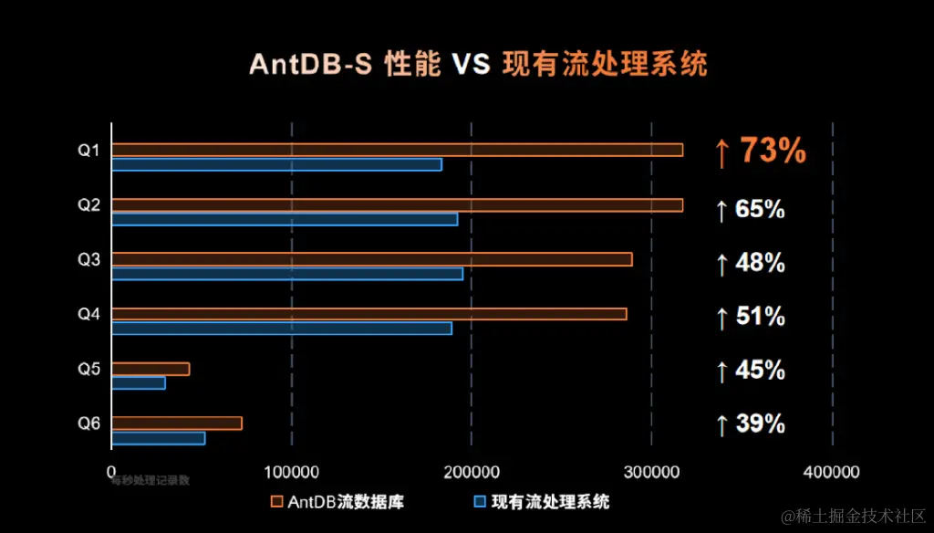 如果说关系数据库代表的是经典的“交易+查询”的模式,那么,AntDB数据库从内核层面引入流式计算则是“事件+推送”的消息模式。这种事件驱动的流式数据库,更注重实时性和并发处理能力。测试数据显示,相比现在流处理领域备受认可的基准测试框架Nexmark,数据库内核流式引擎AntDB-S每一条查询语句的SQL性能都有大幅提升,最高提升达73%。