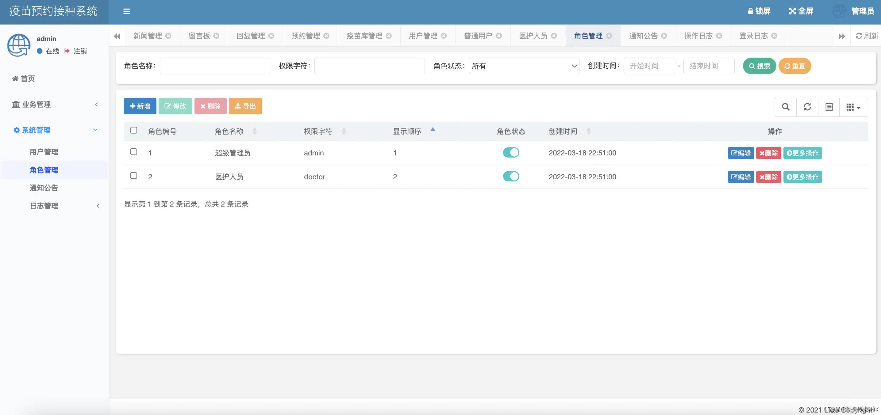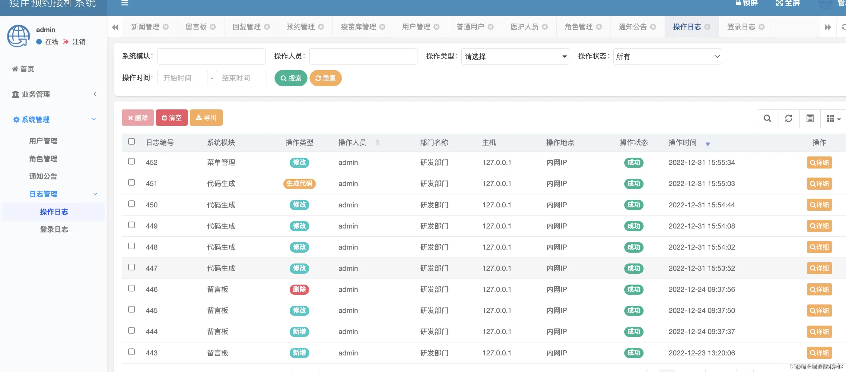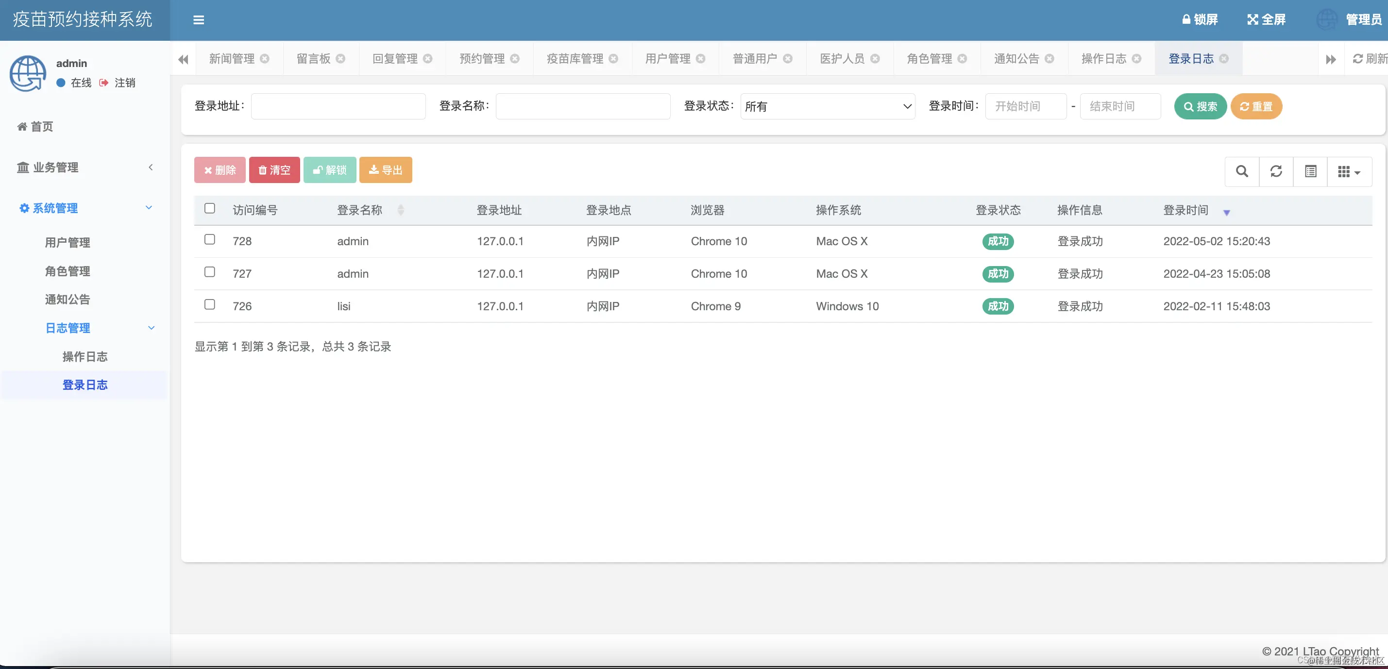 后台管理: 登录 新闻管理 留言板管理 回复管理 预约管理 用户管理 疫苗库管理 系统管理 用户管理 角色管理 日志管理 操作日志 登录日志