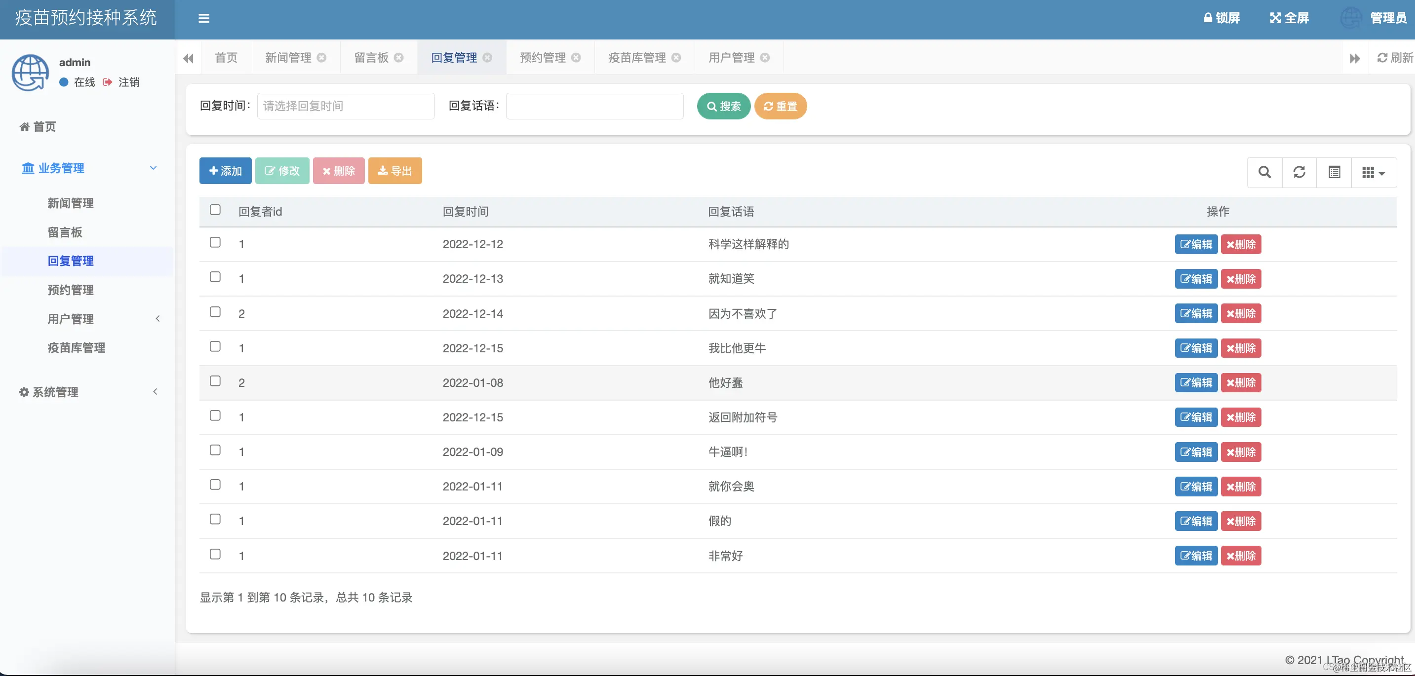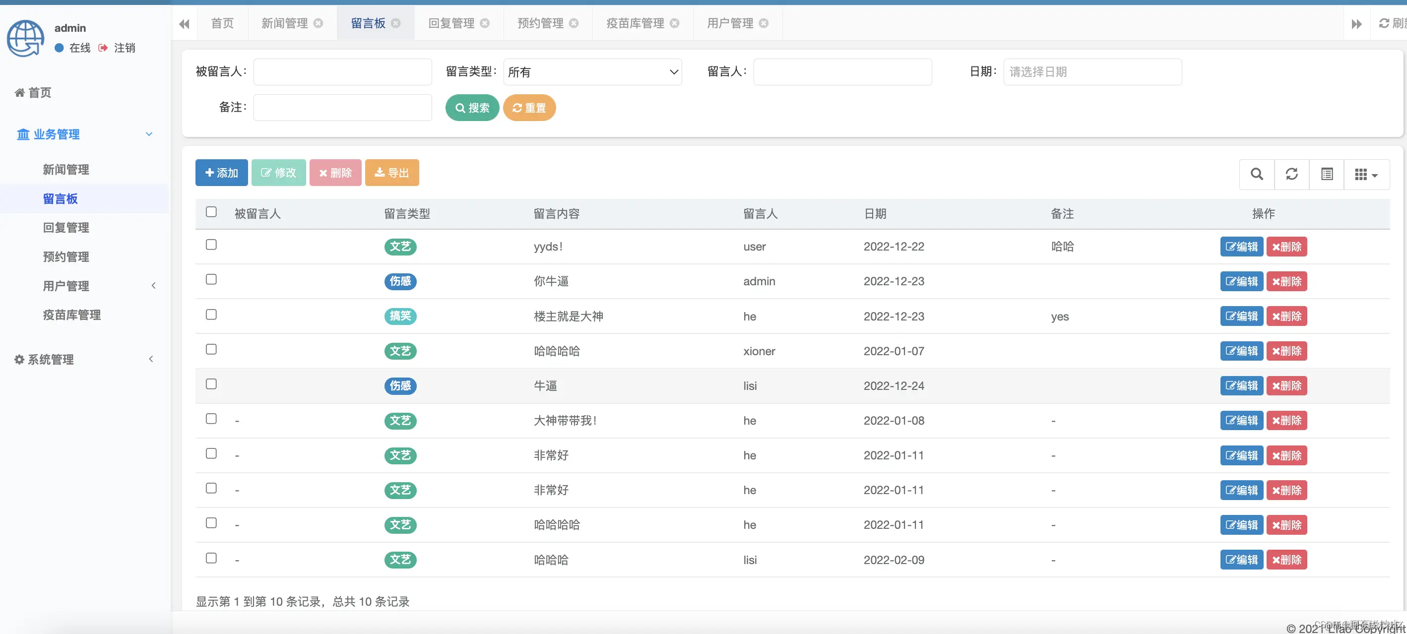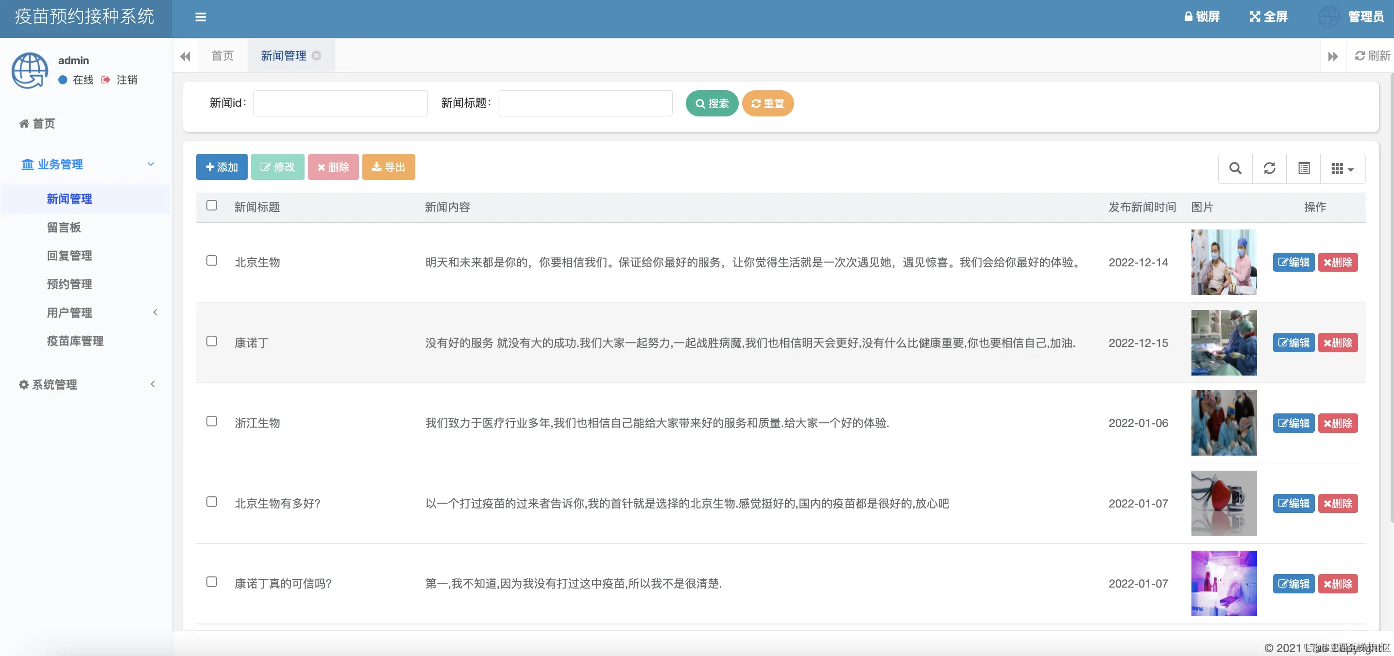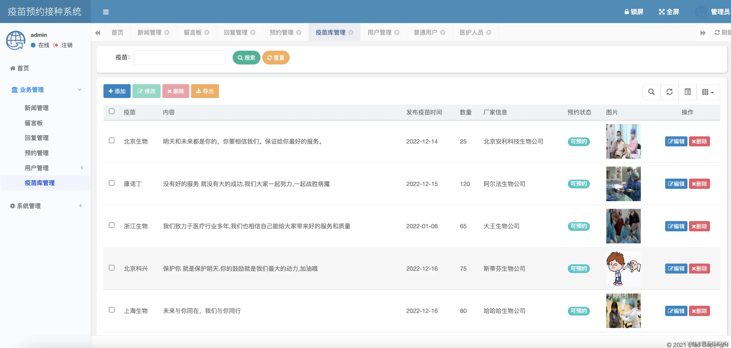 后台管理: 登录 新闻管理 留言板管理 回复管理 预约管理 用户管理 疫苗库管理 系统管理 用户管理 角色管理 日志管理 操作日志 登录日志