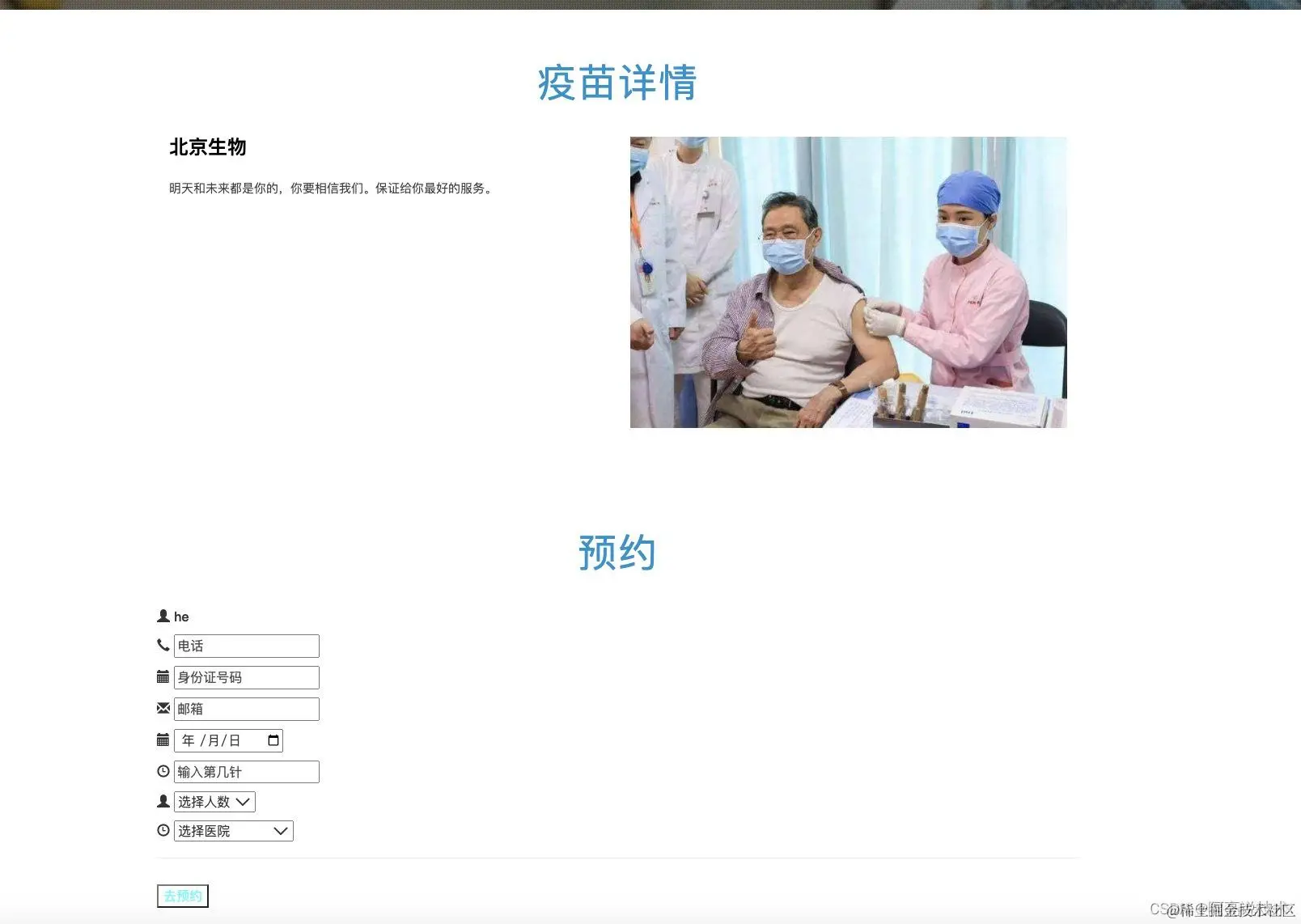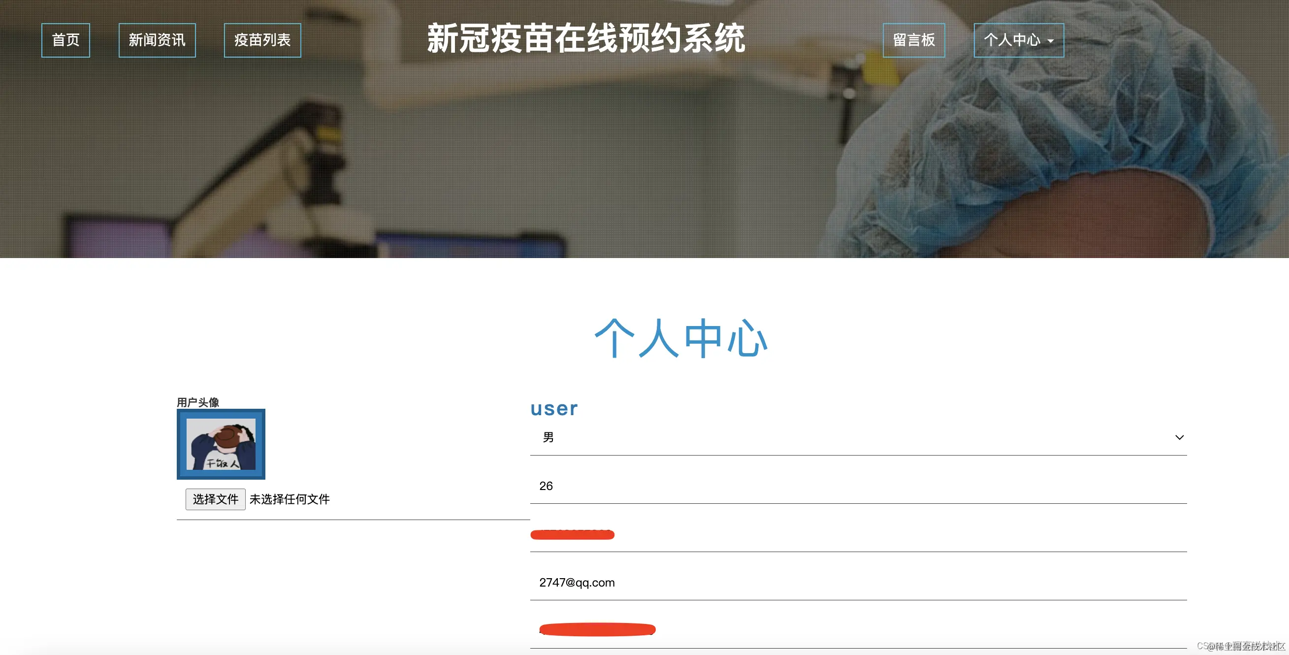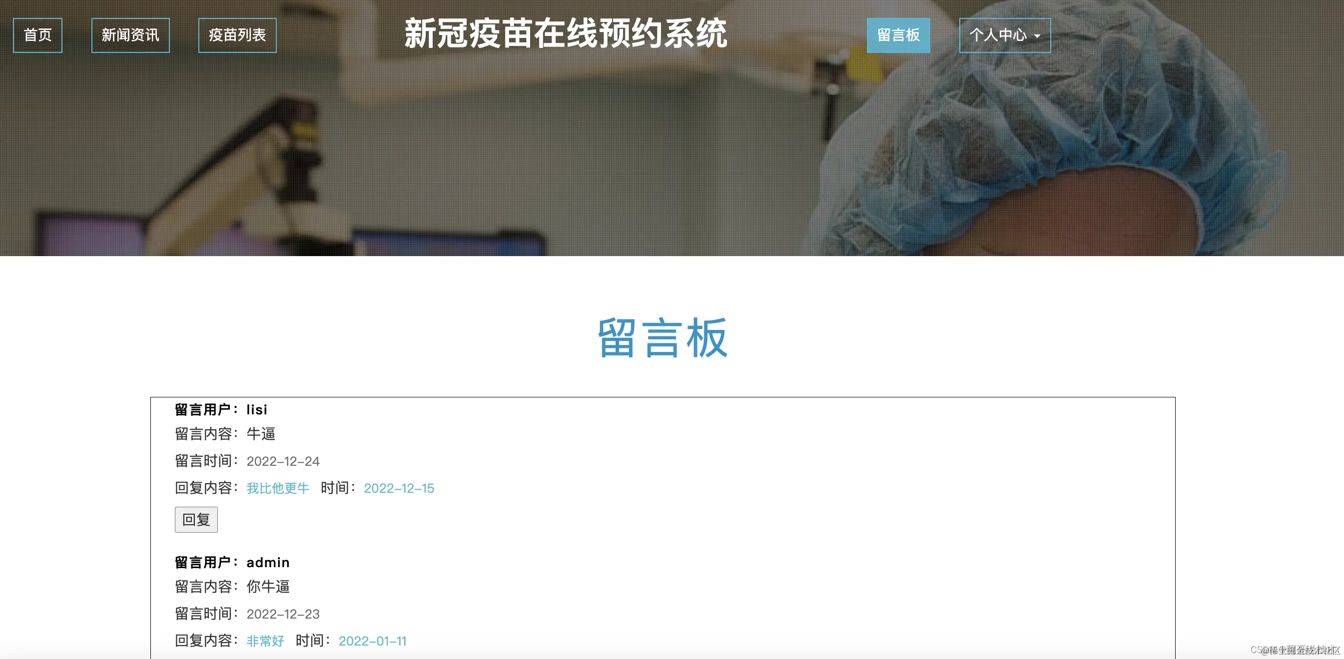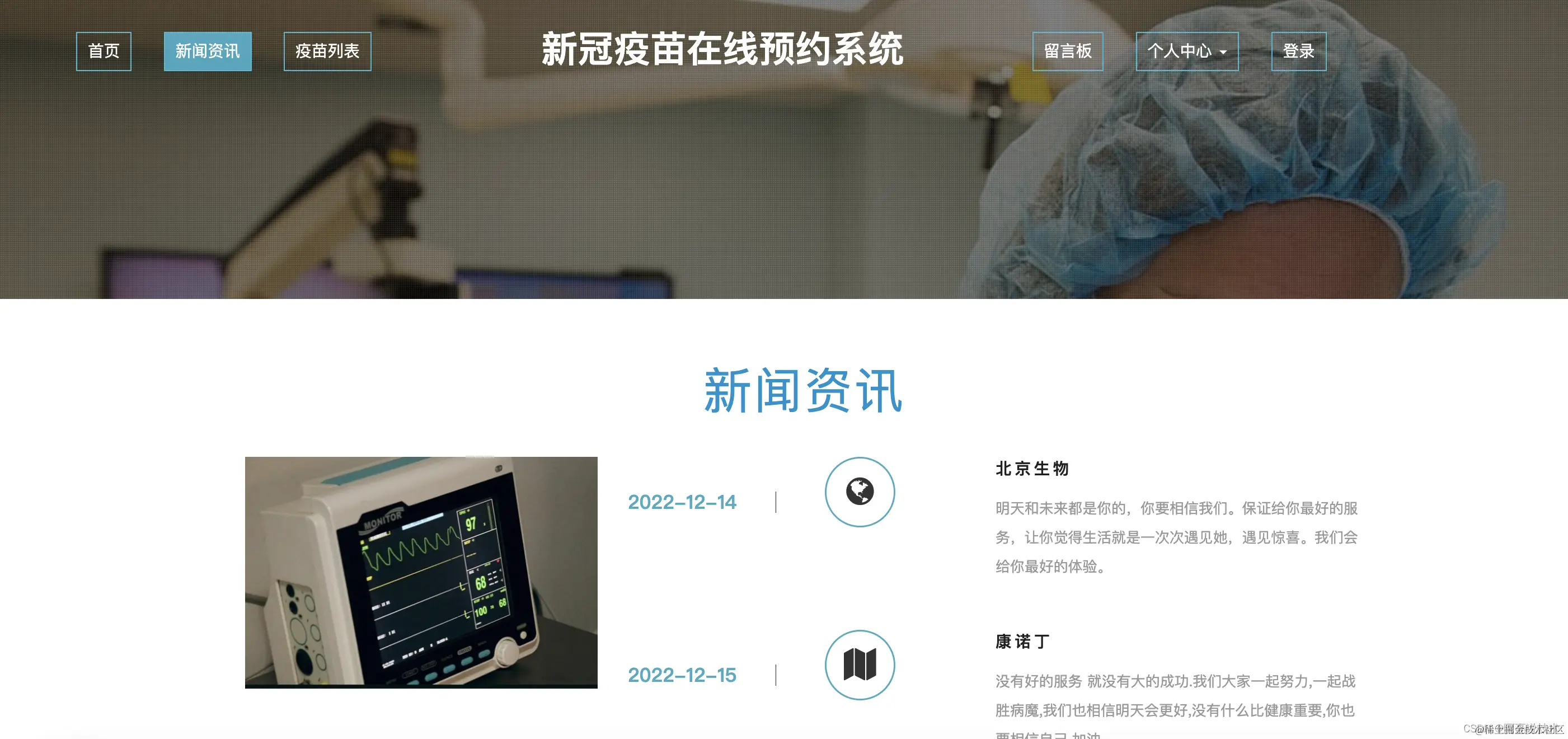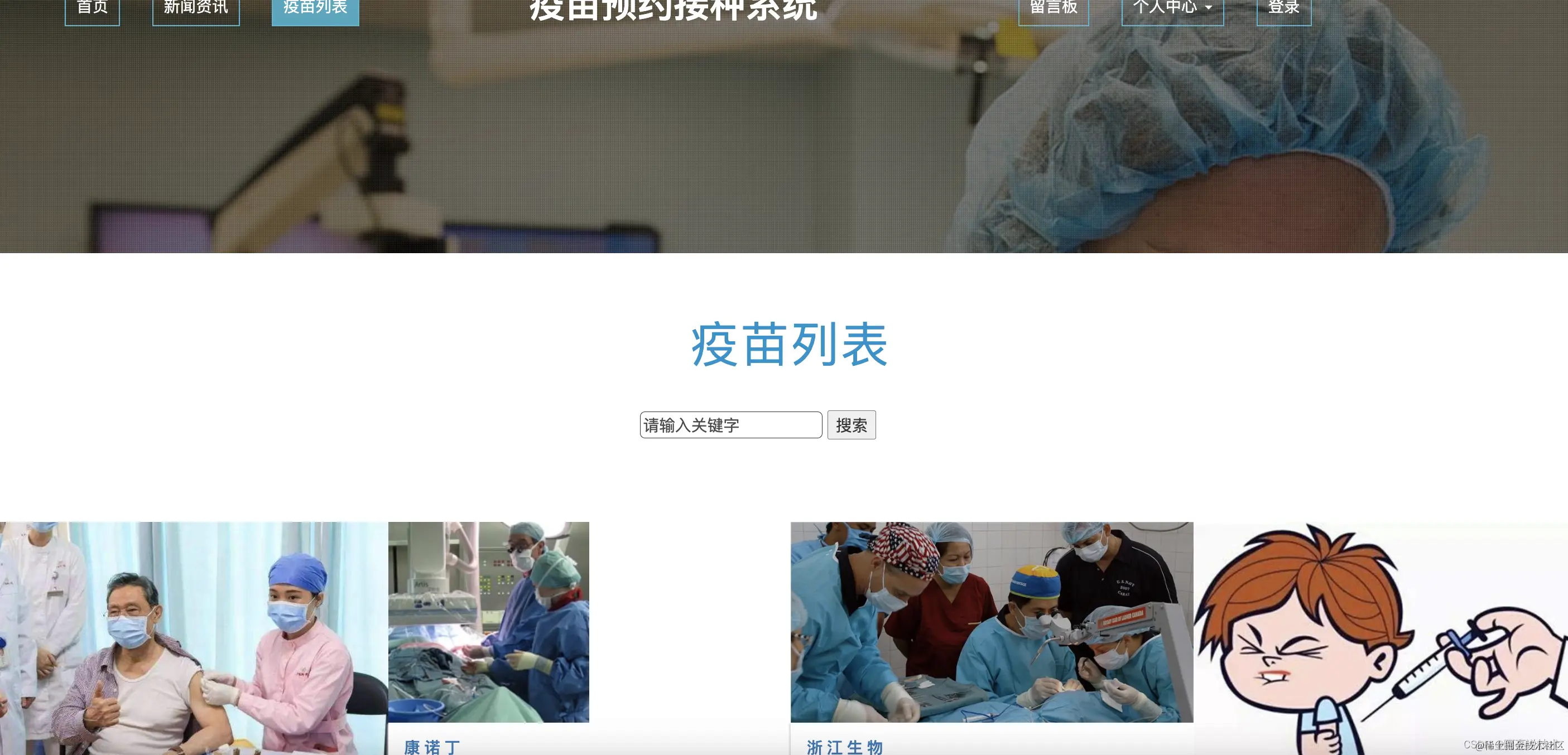 首页: 图片轮播宣传 疫苗列表 在线预约疫苗 新闻资讯 新闻详情 登录注册 留言板 个人中心 我的预约