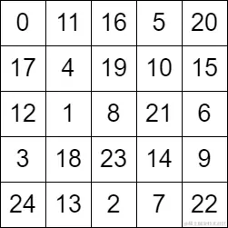输入: grid = [[0,11,16,5,20],[17,4,19,10,15],[12,1,8,21,6],[3,18,23,14,9],[24,13,2,7,22]]