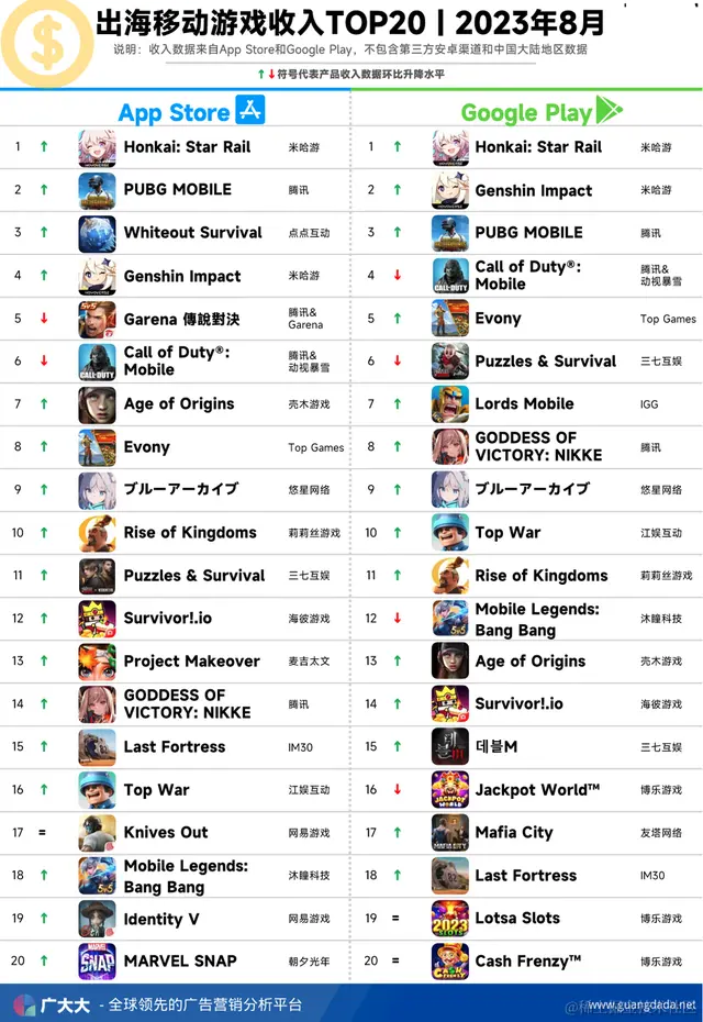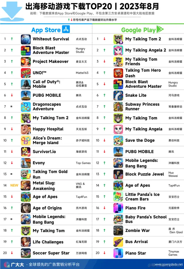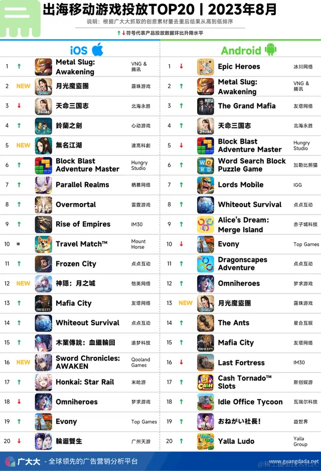 根据广大大——App Intelligence等模块数据,我们整理出2023年8月成功出海手游厂商投放、收入和下载TOP20榜单,帮助更多出海手游从业人员了解全球移动市场变化趋势。
