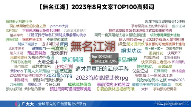 - 观察产品的TOP100高频词,游戏热门文案包括“武侠、江湖、绝学、功法”等关键词,