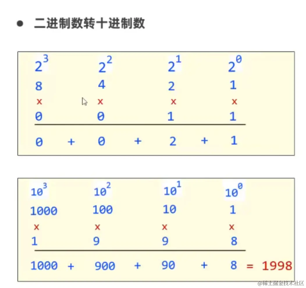 - 二进制:逢2进1 基数为2,数值部分用不同的数字,0、1来表示。 (逢2进1便是没有2的概念,遇到2就像前面进一位)比如2,看到2向前进1,2用二进制表示便是10,3是11依此类推