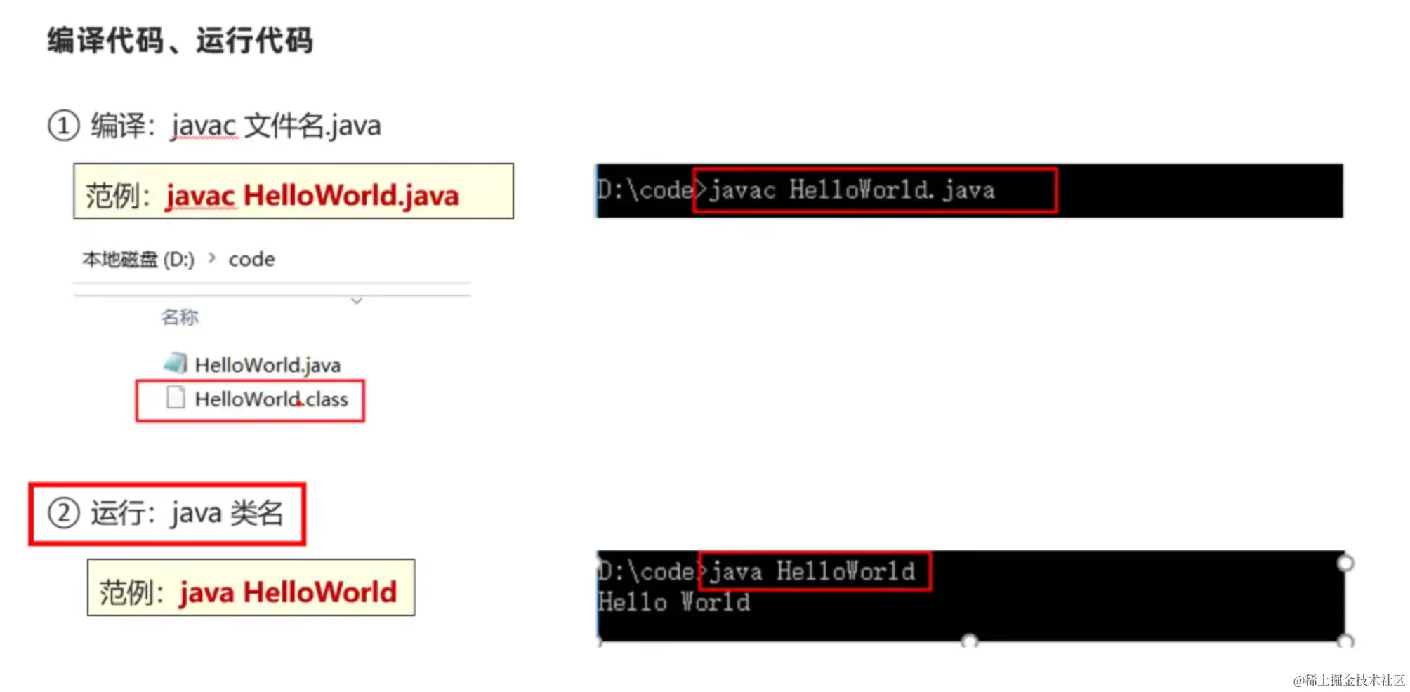编写好之后通过在文件所在目录执行 javac HelloWorld.java 进行编译,然后运行