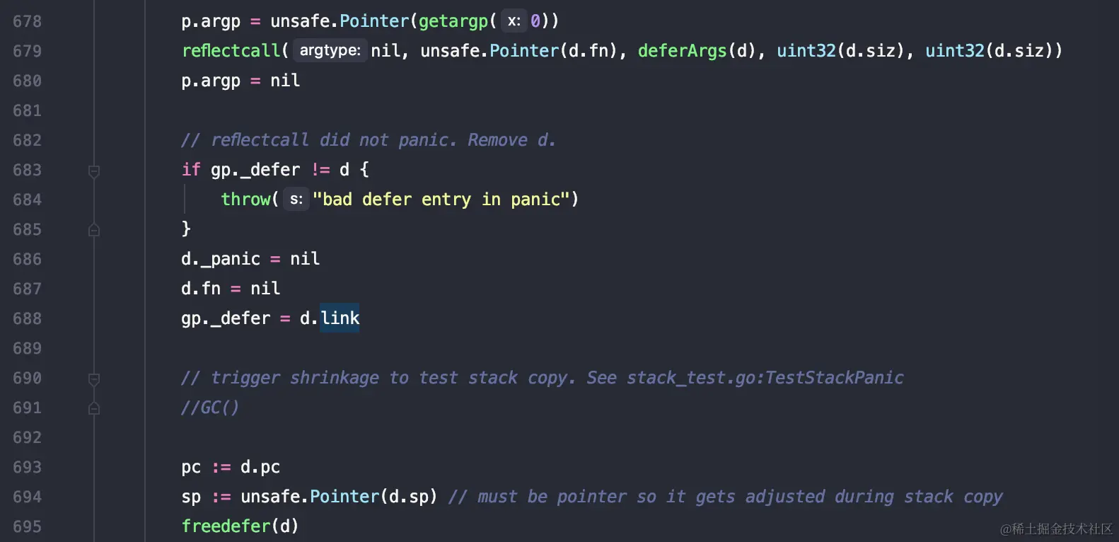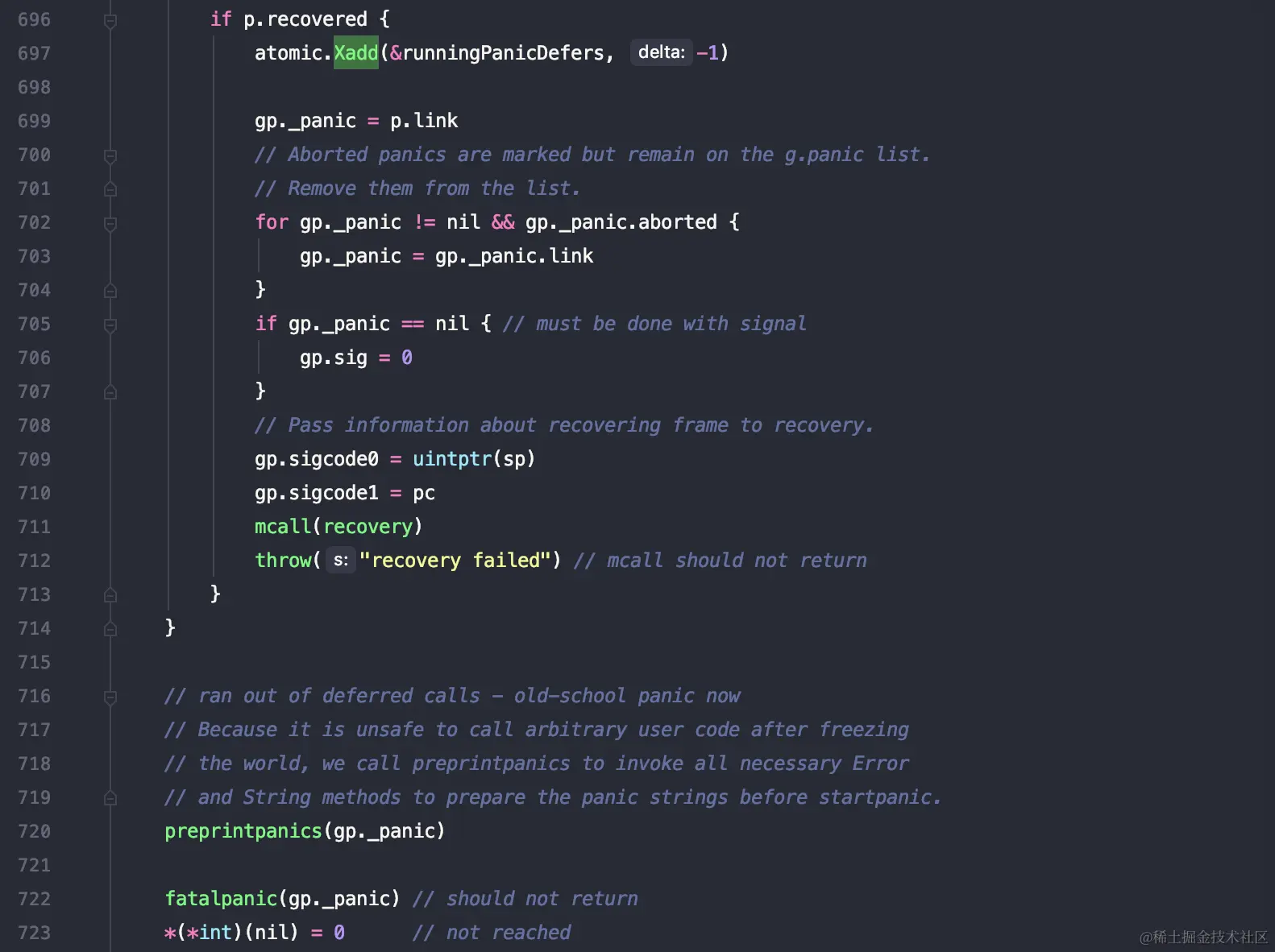 702 - 704 这里注释也说明了,之前有一些终止的panic,还在当前链表里面,移除这些_panic结构。