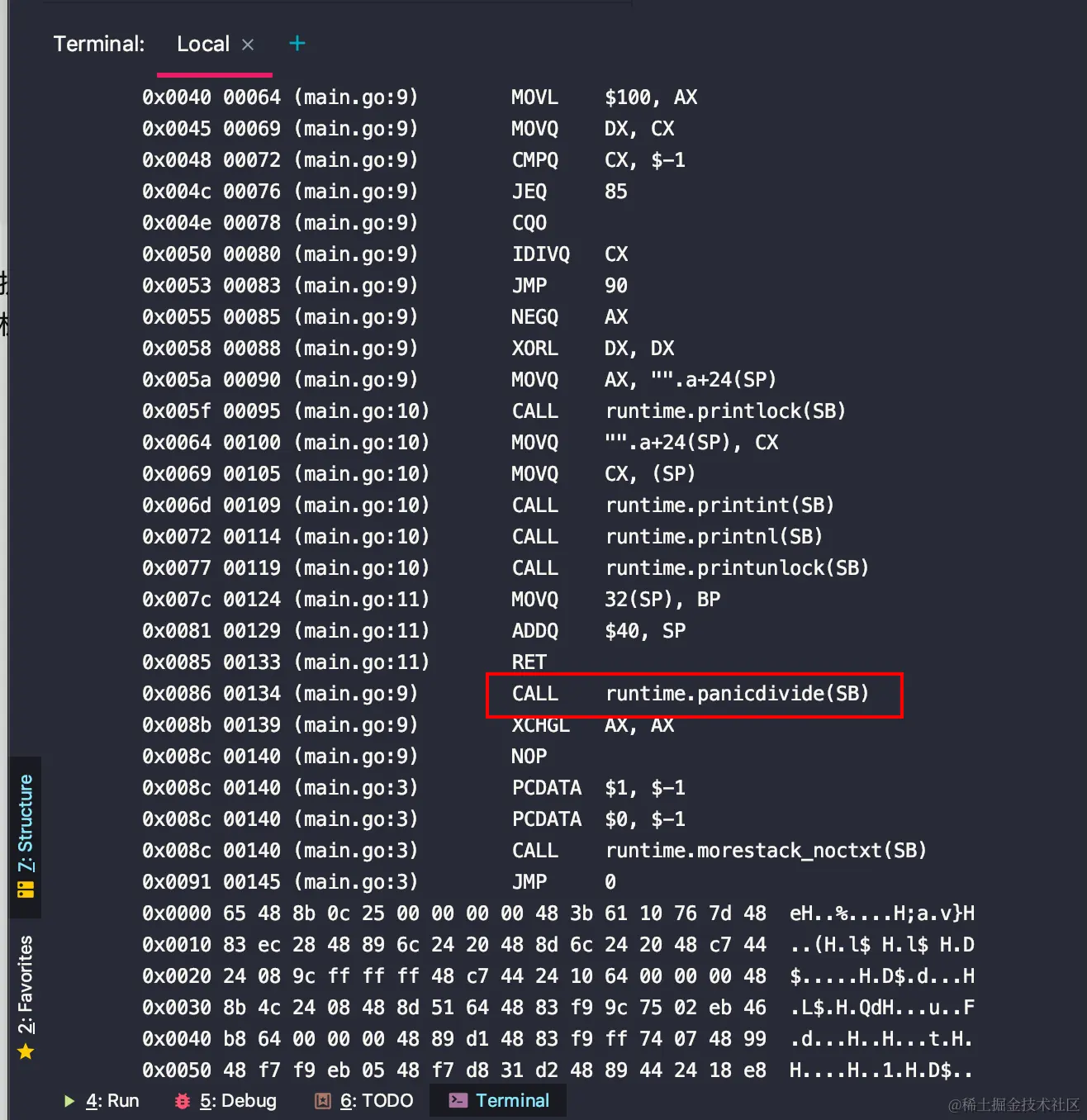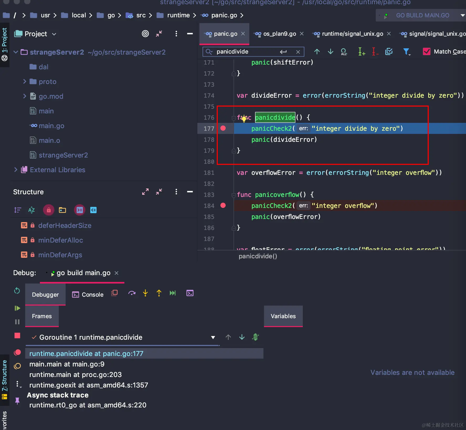 我们写了一个比较简单的除0的代码,我们debug看到这里会到panicdivide这个函数中,但是我们发现这里是从main.go里面直接调用过来的,中间似乎缺失了具体的调用,记得之前在golang启动那篇文章里面我们也发现的这个问题,Golang有很多逻辑是编译期间就确定的。