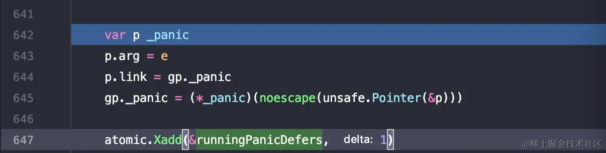 647 - 647通过原子的一些操作,增加了runningPanicDefers变量,这个变量从名字其实也是比较清楚的,表示正在运行中的panic的数量