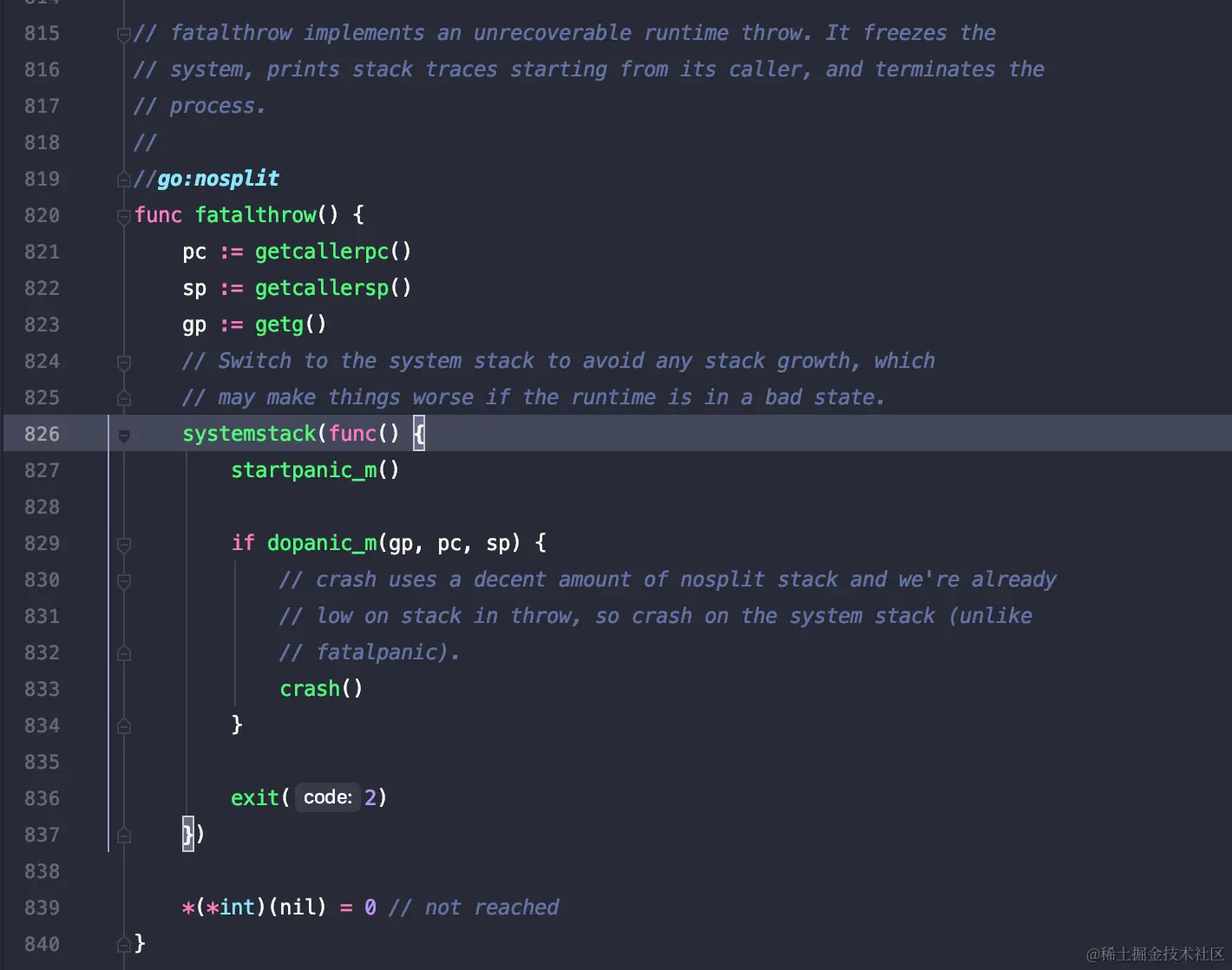 827-836 这里进行了一些处理工作,最终执行了crash或者exit的方式。 这里具体的startpanic_m和dopanic_m的代码就不深究了。