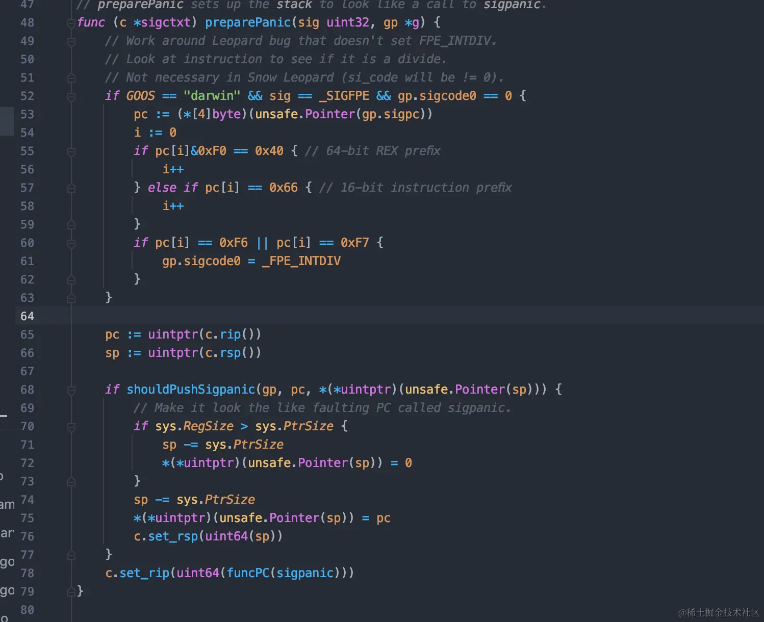 68行,有一个shouldPushSigpanic,这里最后一行,我们会赛一个函数的地址,我们继续往下看。