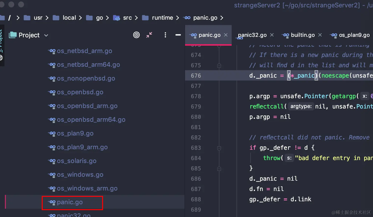 目前手上的代码库是Go SDK 1.13.4,GO sdk的代码目录也比较清晰,在runtime目录下可以找到panic.go这个文件。