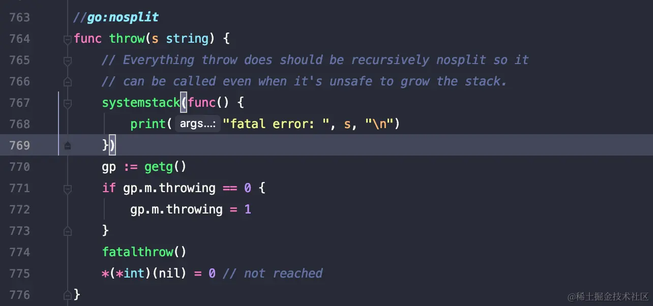 774 :开始执行fatalthrow,并且看775行,正常来说应该不会执行才对,775行的写法有不少地方都有这种写法,虽然跑不到,但还是加了这类兜底逻辑,可能是代码风格,也可能是为了保底。