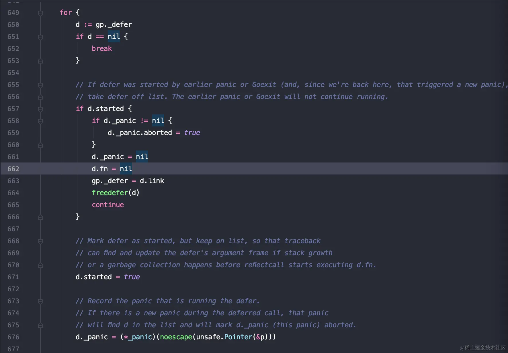 657 - 666 会判断当前defer函数的started参数,如果为true,说明之前已经执行过,但是现在又重新执行了一遍,可能是之前的defer函数又出现了panic。 于是我们把当前defer函数从执行列表里面取走,不再执行。
