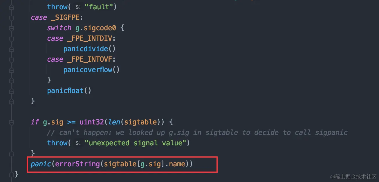 当前面几个信号无法覆盖的情况后,最终兜底走了panic的方法。 至此我们回答了问题4(Golang如何感知系统异常)。