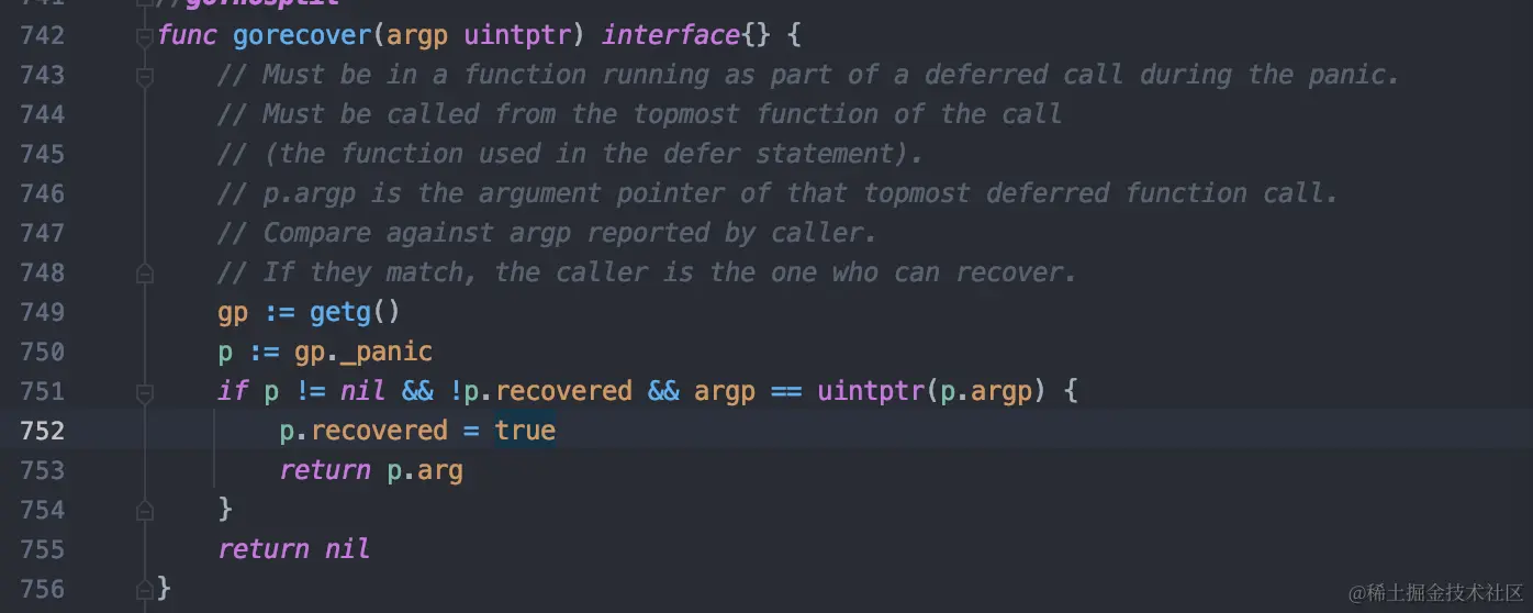 650 - 653 取当前goroutine的defer函数,如果没有的话,直接跳出for循环,这里可以看到如果recover没有放在defer函数里面,panic的时候根本就没有机会去执行。