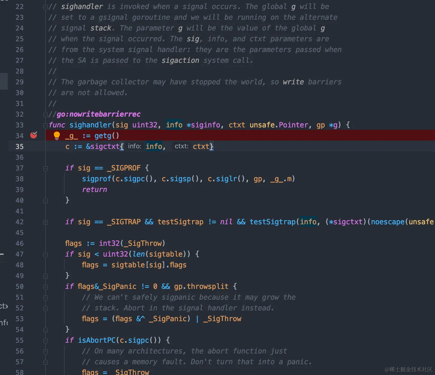 我们可以看到这里有一个sighandler的函数,这里是golang注册的对于系统信号量的一个处理。信号量其实比较多,我们暂且不管具体的一些实现,这里有一个preparePanic,我们可以关注一下。