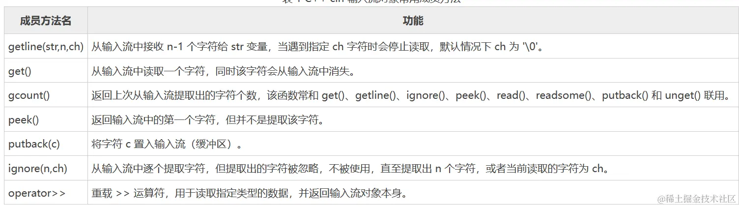 表 1 罗列了 cin 对象常用的一些成员方法以及它们的功能: