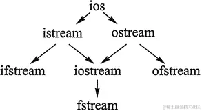 其中,图中的箭头代表各个类之间的派生关系。比如,ios 是所有流类的基类,它派生出 istream 和 ostream。特别需要指出的是,为了避免多继承的二义性,从 ios 派生出 istream 和 ostream 时,均使用了 virtual 关键字(虚继承)。
