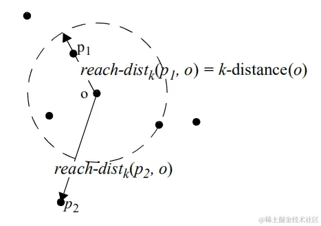 - 若在对象的k-邻域内,则可达距离就是给定点关于对象o的k-距离;