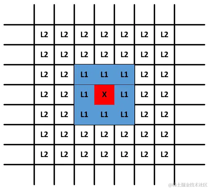 以二维情况为例,此时网格间的距离为 ,需要记住的一点是,网格单元的数量基于数据空间的分区,并且与数据点的数量无关。这是决定该方法在低维数据上的效率的重要因素,在这种情况下,网格单元的数量可能不多。 另一方面,此方法不适用于更高维度的数据。对于给定的单元格,其 邻居被定义为通过最多1个单元间的边界可从该单元到达的单元格的集合。请注意,在一个角上接触的两个单元格也是 邻居。 邻居是通过跨越2个或3个边界而获得的那些单元格。 上图中显示了标记为 的特定单元格及其 和 邻居集。 显然,内部单元具有8个 邻居和40个 邻居。 然后,可以立即观察到以下性质: